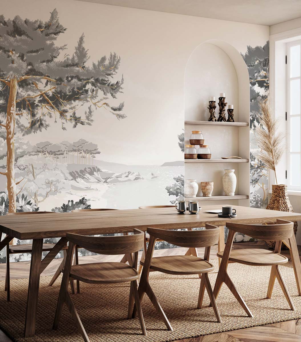 Use:Bring coastal serenity into your home with our Quiberon wallpaper mural, inspired by the peaceful shores of the French coastline. This mural showcases a tranquil seaside landscape with gentle trees and distant waters, blending soft, natural hues to evoke the calming essence of Quiberon. Perfect for a dining room, living area, or study, this mural creates a relaxed, sophisticated ambiance that connects your space to nature.
