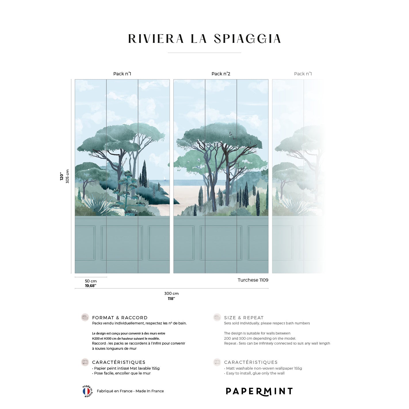 Use:Bring the serene beauty of the Mediterranean coast into your home with our Riviera La Spiaggia - Chair Rail wallpaper mural. This breathtaking mural features a scenic landscape of lush pine trees, serene beaches, and calming sea views, all rendered in a soft, hand-painted style. The built-in turquoise chair rail adds an elegant architectural touch, seamlessly blending into the design and elevating the aesthetic of any room. Crafted from premium non-woven material, this mural is designed for effortless installation?simply paste the wall and hang the panels. Its ultra-removable design allows for easy removal in full strips without damaging your walls, making it a versatile option for any space. The mural's seamless, designer matte finish adds a sophisticated, contemporary look, perfect for creating a tranquil, coastal atmosphere in living rooms, bedrooms, or dining spaces. Experience a blend of art and functionality, where timeless elegance meets modern convenience.