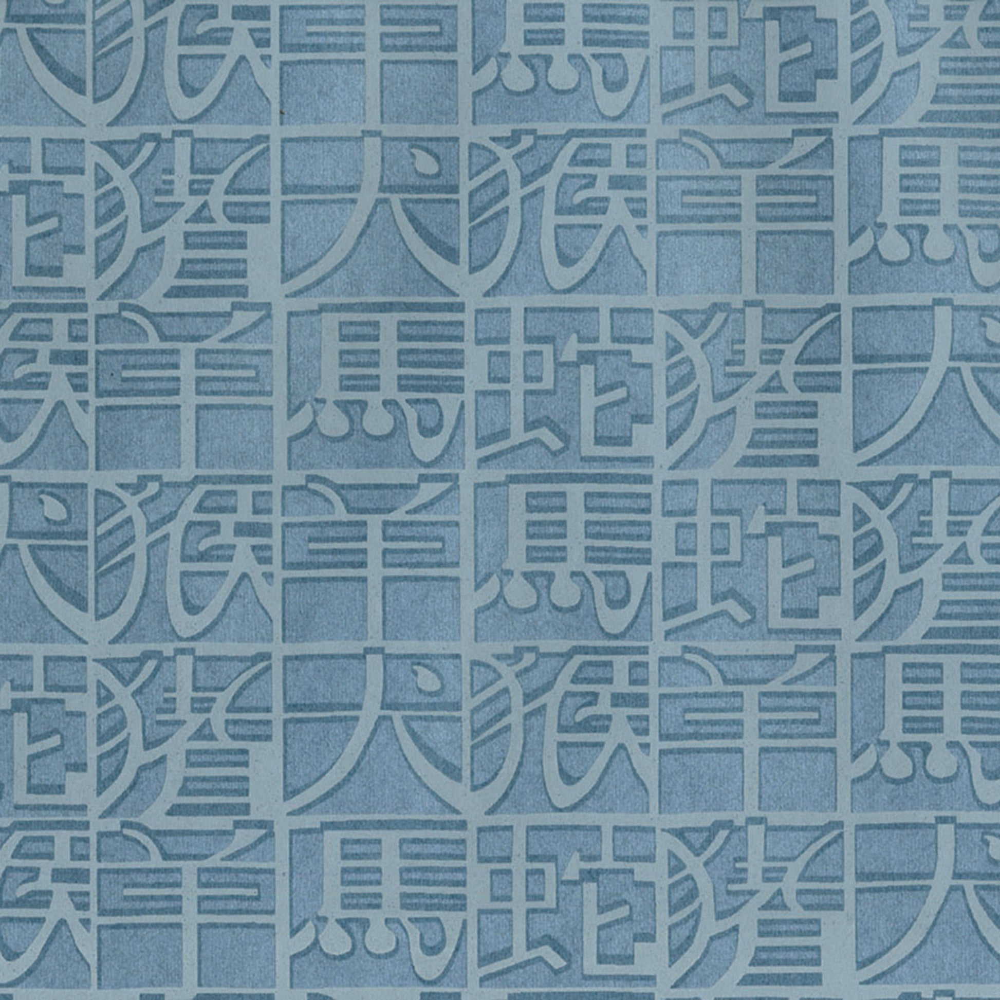 Use:A Missoni Home Asian abstract geo design wallpaper in hues of sky blue on a metallic ground.