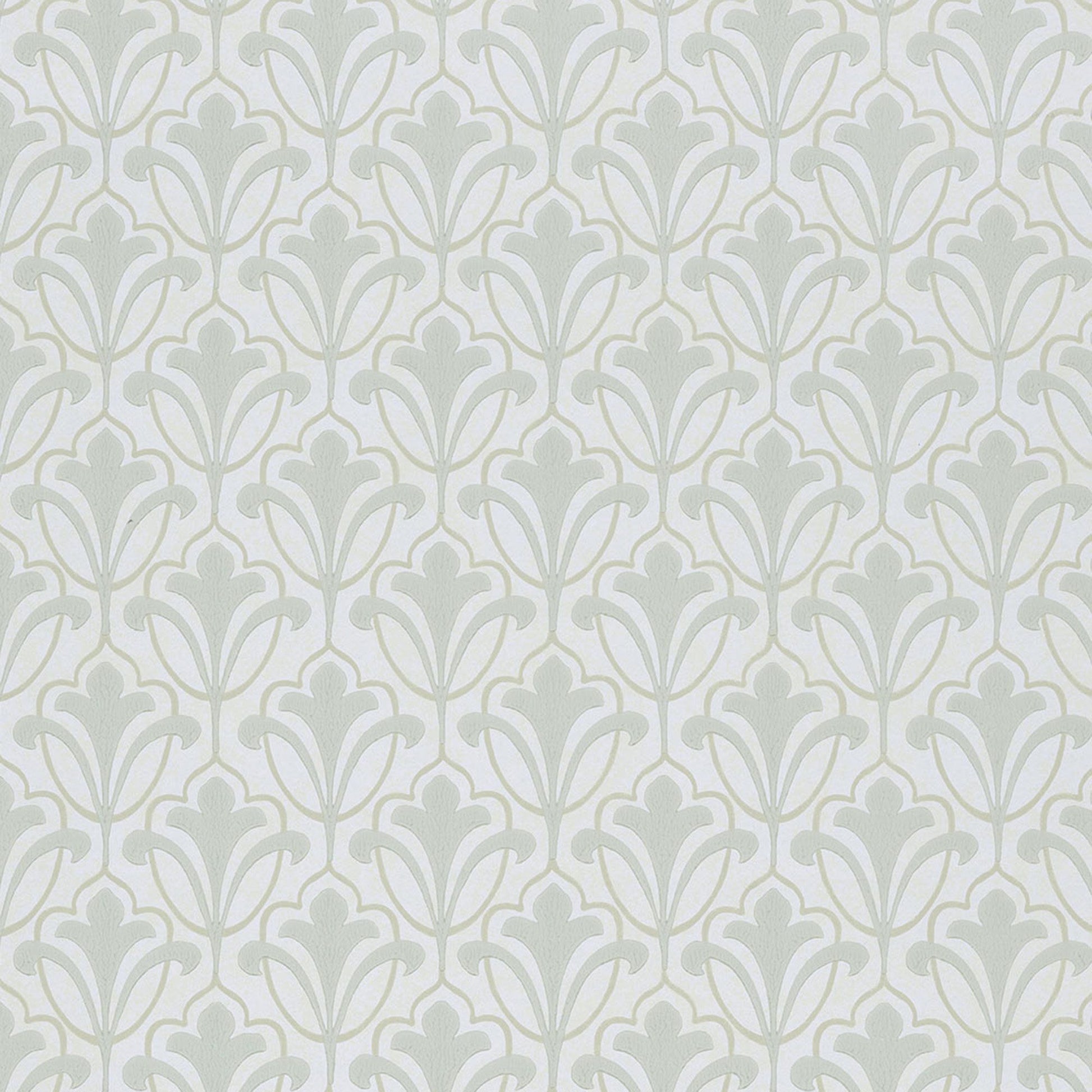 Use:Ornamental floral design wallpaper. In hues of spa blue coloration.