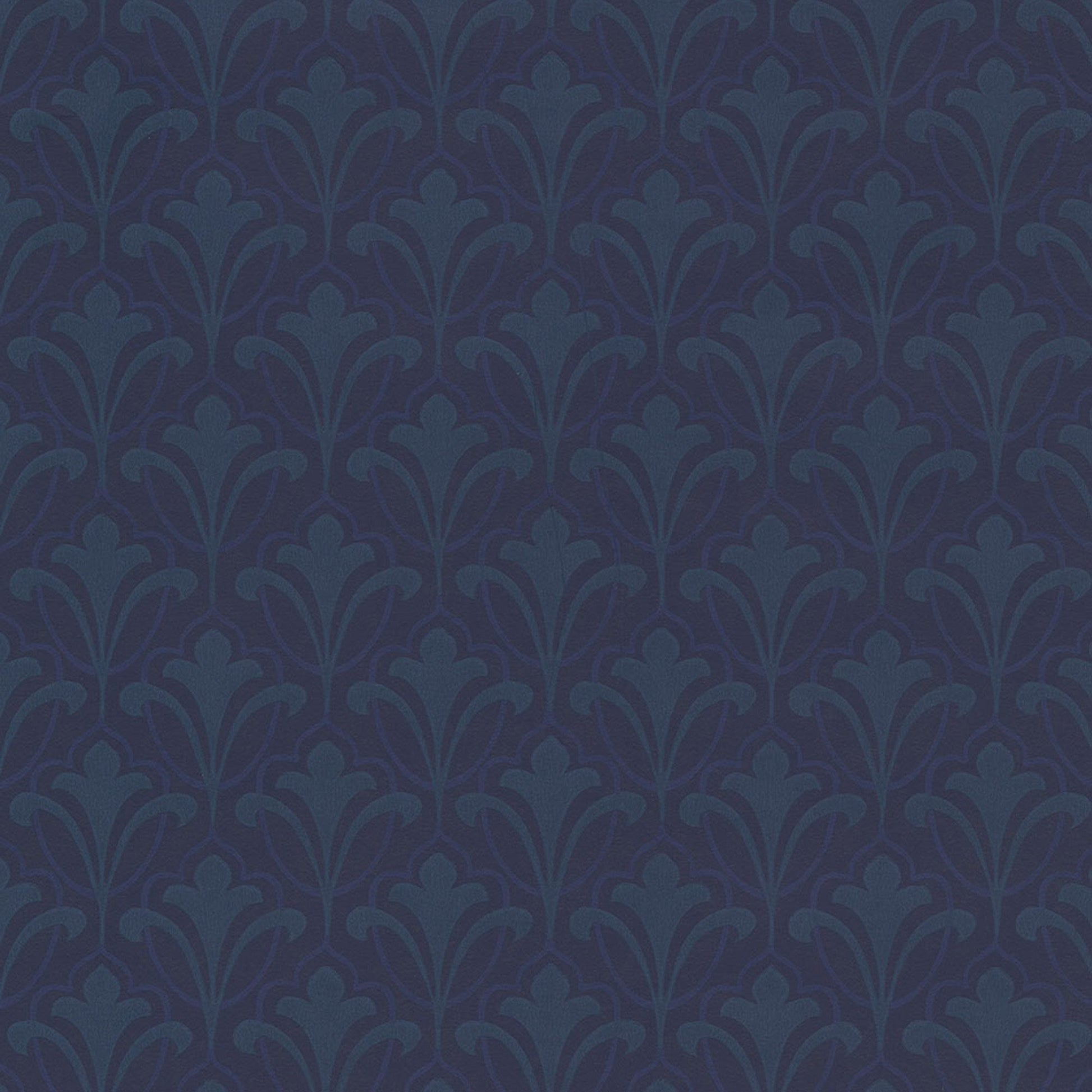 Use:Ornamental floral design wallpaper. In hues of navy blue, teal and purple.