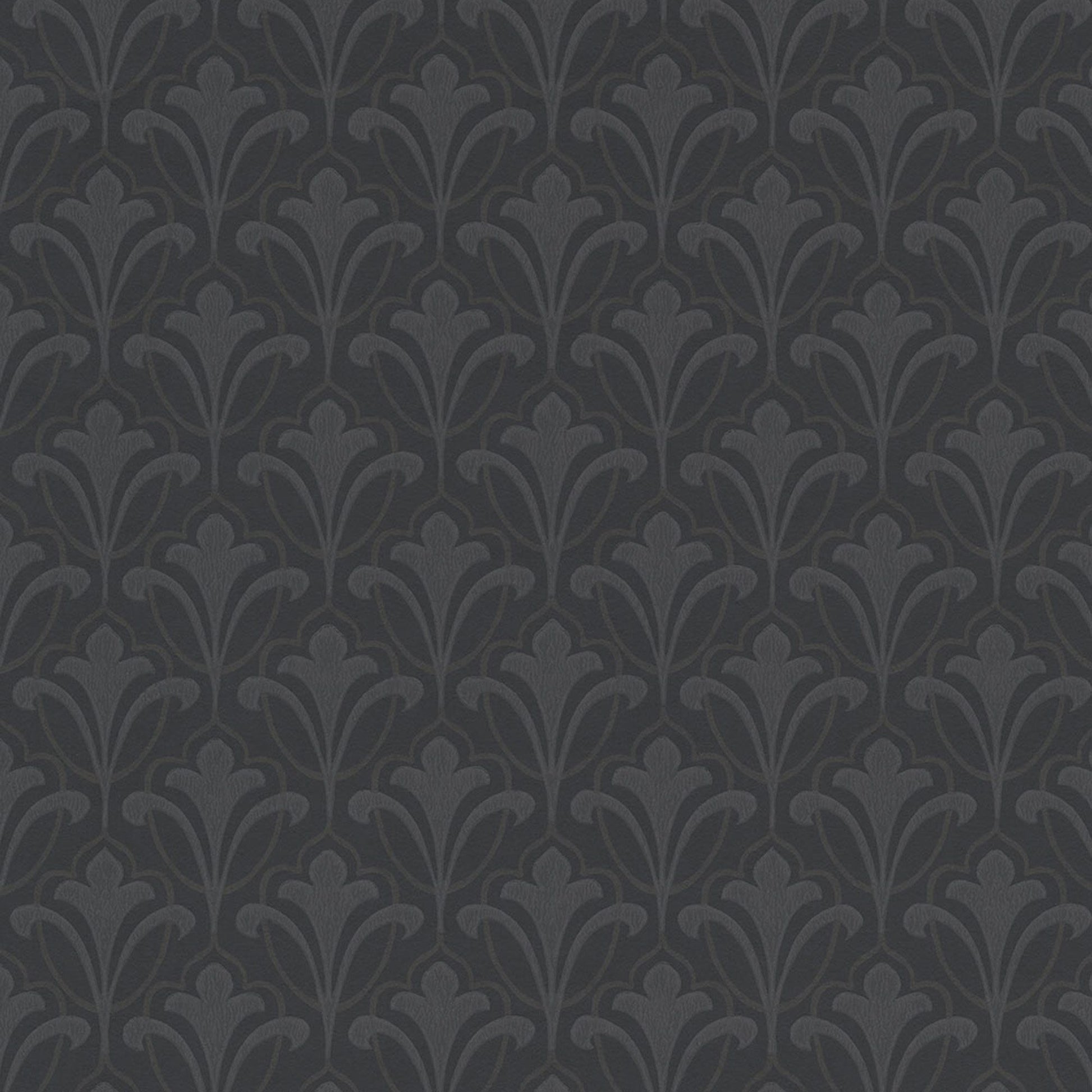 Use:Ornamental floral design wallpaper. In hues of black and charcoal.