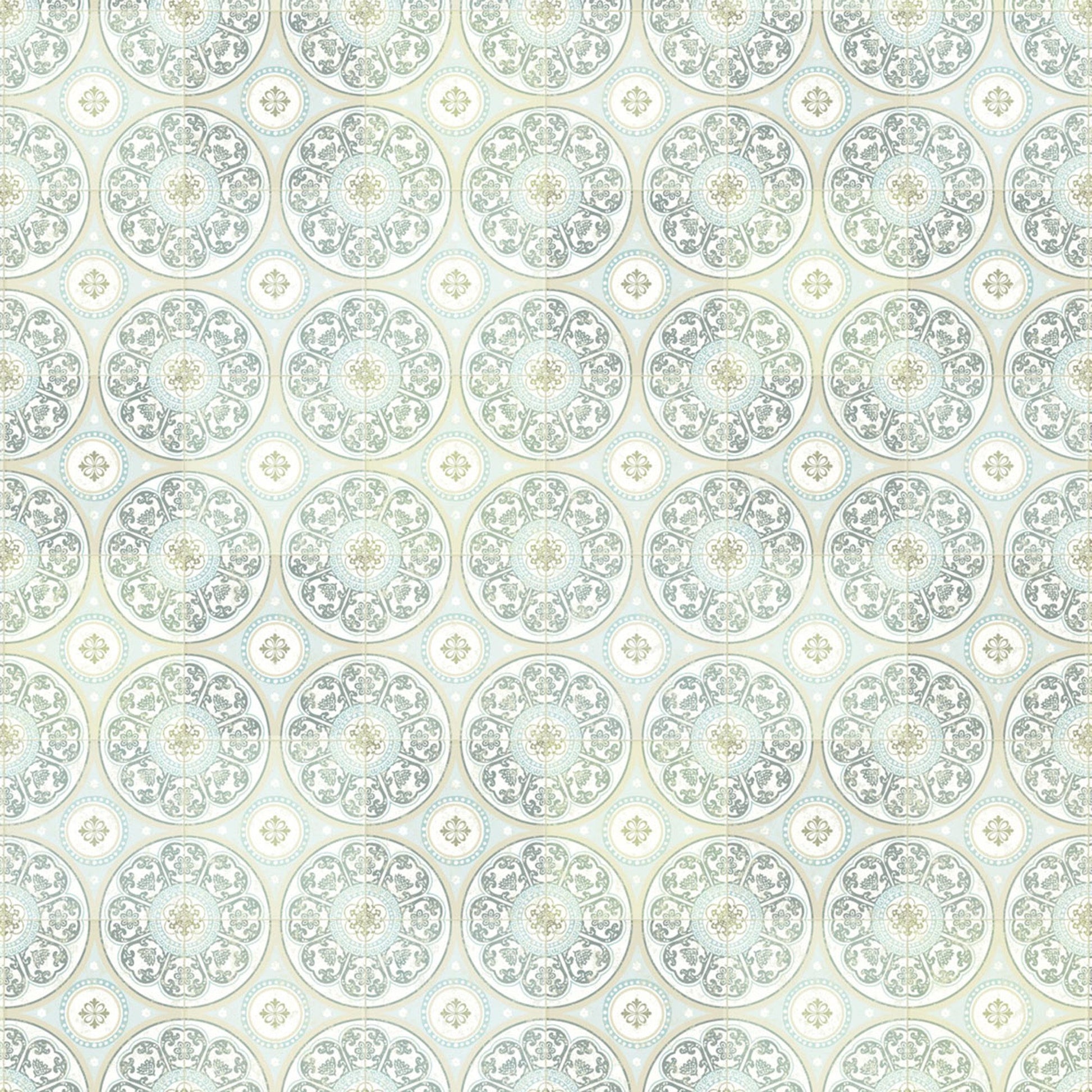 Use:Floral medallion tile design wallpaper mural. In hues of spa blue, seafoam, beige and cream coloration.