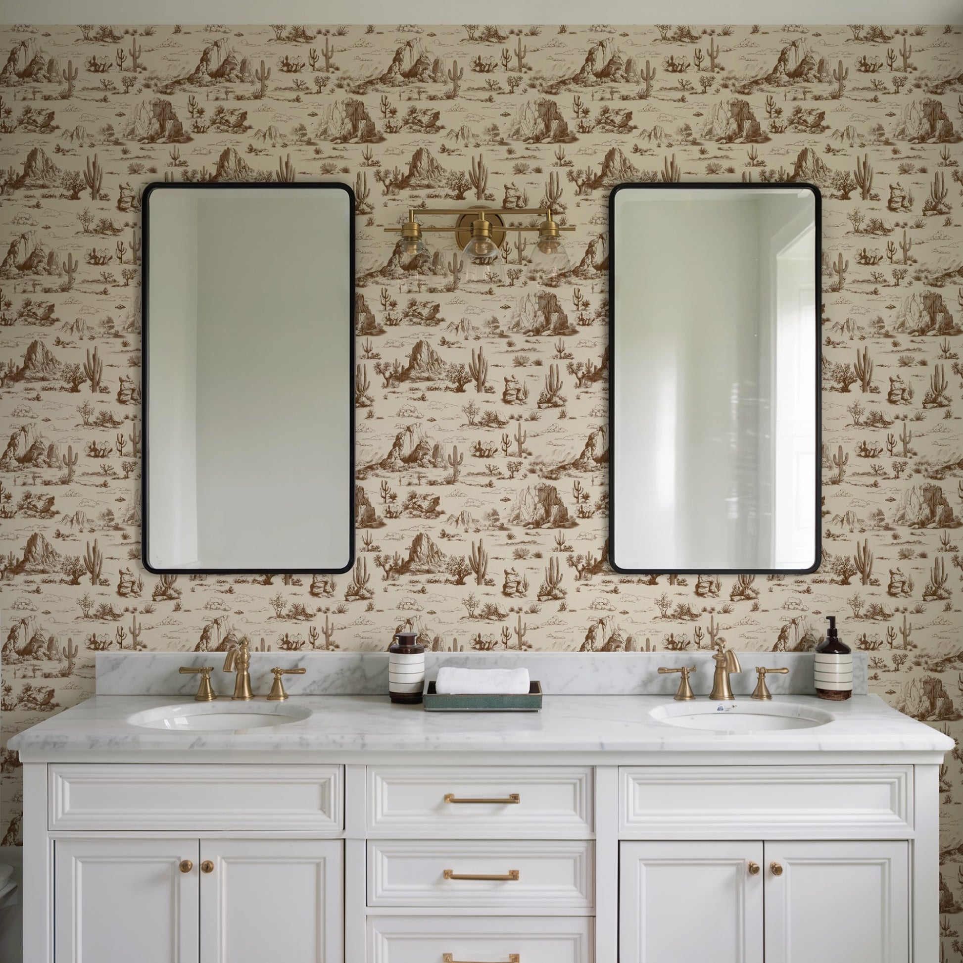 Use:Introducing our peel & stick ?Area 51 Toile? wallpaper ? a clever and curious twist on traditional toile design. At first glance, it appears to be a classic pastoral print, with finely detailed illustrations of desert landscapes, rugged rock formations, and iconic southwestern cacti. But take a closer look? is there something hiding behind that cactus? Are these U.F.O.s on the skyline? Inspired by the legends of Roswell and the enduring mystery of Area 51, this wallpaper invites a second glance?and maybe even a double take. Subtle, tongue-in-cheek details are tucked into the scene, adding a playful narrative element to your walls. It?s refined, a little rebellious, and perfect for interiors that love a bit of the unexpected. Our wallpaper is crafted from premium, repositionable material for easy application and mess-free removal. Whether you're decorating a hallway, powder room, or reading nook, this Area 51 Toile adds design, intrigue, and a story worth telling..