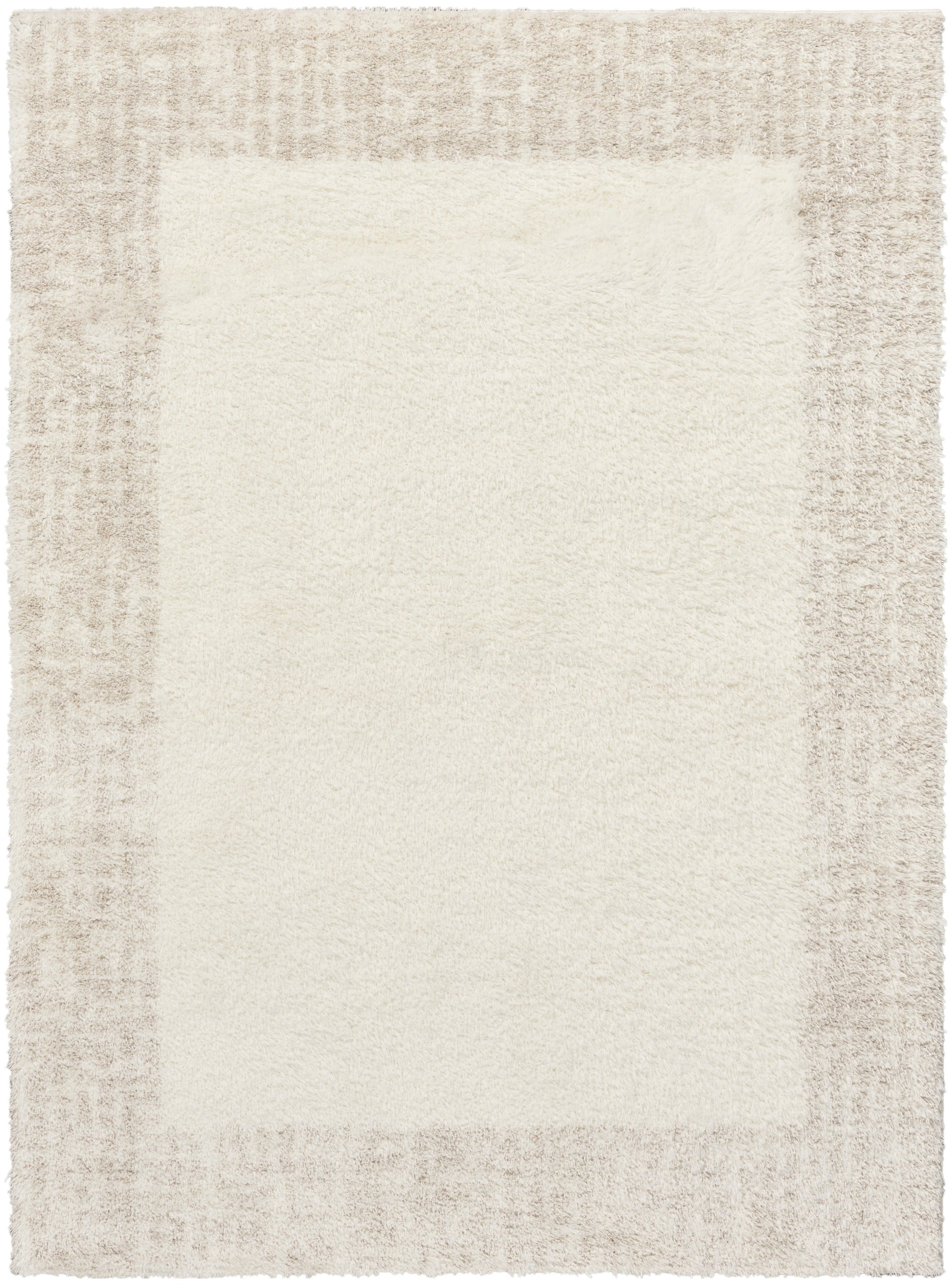 About Us: The Pacific Shag Collection offers instant comfort and texture with a delightfully thick texture you?ll love to sink your toes into. Choose from a range of solid, neutral colors to complement your style. Pacific Shag is made with plush polyester yarns. Comfort meets sophistication with this beige and ivory shag rug from the Pacific Shag collection. This modern rug boasts a luxuriously thick, silk-like pile and cobble-style abstract border that defines spaces with a shimmer. Machine-made from polyester. Please note: this rug is flammable (Fails U.S. Department of Commerce Standard FF2-70); do not use near sources of ignition.