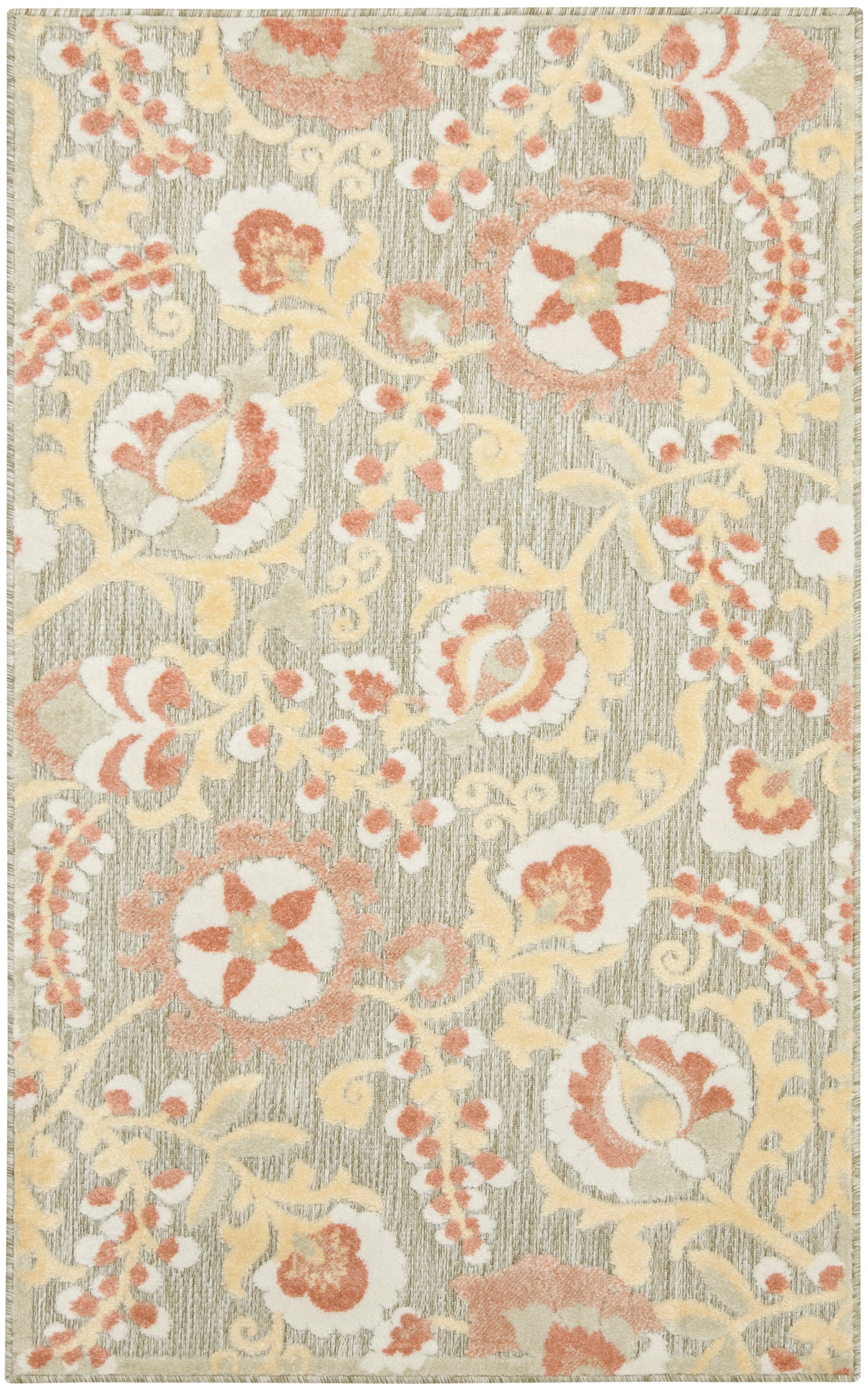 About Us: This sunny and sensational collection of flat woven outdoor rugs is pretty, practical and simply perfect for high traffic areas. With its inviting assortment of classic and contemporary designs, tempting color palettes and terrific textures, these multipurpose rugs will afford an air of simple sophistication to any environment.100% Polypropylene ? Flat Woven In swirling vines and flowers of rose, yellow, and sage, this Aloha outdoor rug complements your patio, porch or poolside setting. A high-low weave combines textural patterns with an intricately woven base for exceptional look that stands up to the elements. Machine-made from premium stain-resistant fibers that are easily washable with a hose: simply rinse and allow both sides time to fully air dry.