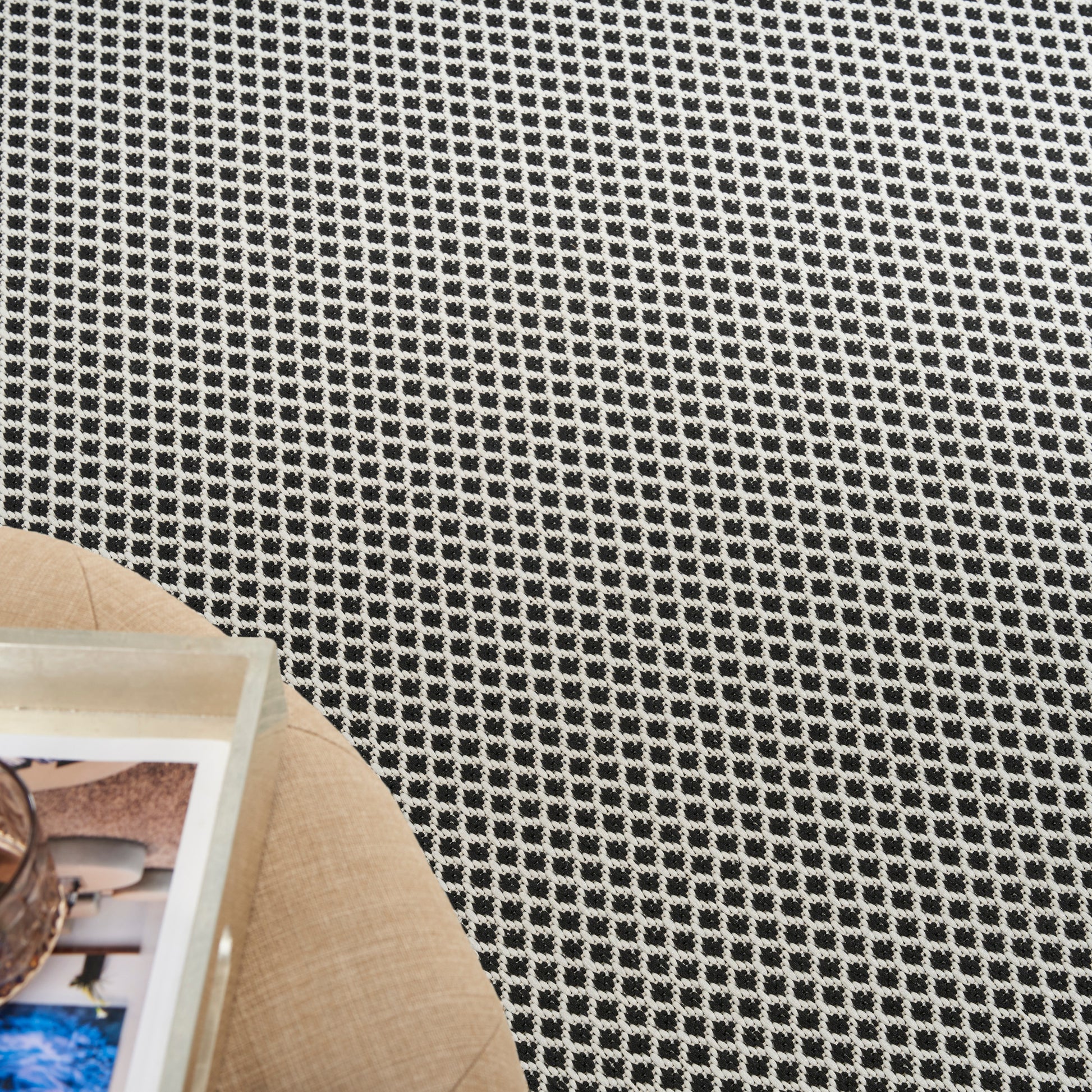 About Us: Set a warm and relaxing tone with the Courtyard Collection. These elegantly understated outdoor rugs feature subtly textured geometric patterns in fashionable palettes designed to anchor modern and contemporary decor. Flat woven polypropylene fibers stand up to heavy traffic and are easy to clean: simply hose-rinse and air dry. Courtyard rugs are ideal for your porch, patio, or any indoor space. With its striking geometric pattern, this Courtyard Collection outdoor rug exudes contemporary style. Its subtly textured surface is crafted in black and white for a seamless complement to modern settings. Machine made from a blend of polypropylene and polyester in a flatweave style that stands up to heavy traffic and is easily washable outdoors: just hose-rinse and air dry.