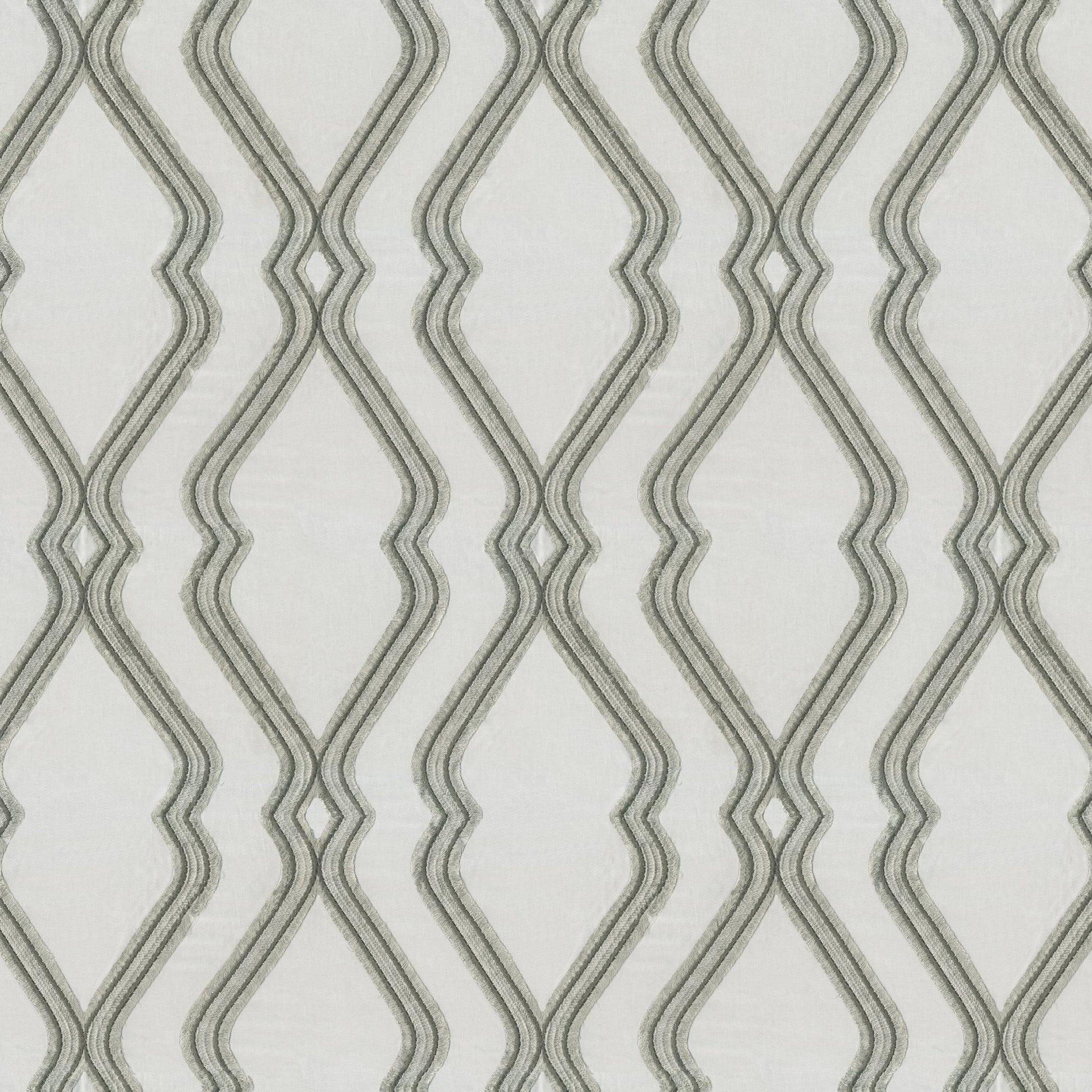 Use:Eye catching large ogee design embroidery with eyelash edging, this fabric will be the focal point of any room. Yarns in light to dark grey hues on a white sateen base cloth.