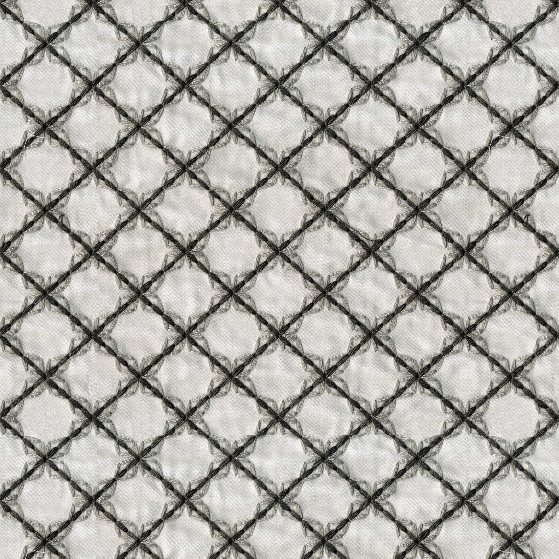 Use:A tranquilly embroidered woven fabric with an elaborate diamond pattern for your multi purpose use. A combination of grey and black hues on a white sateen base cloth.