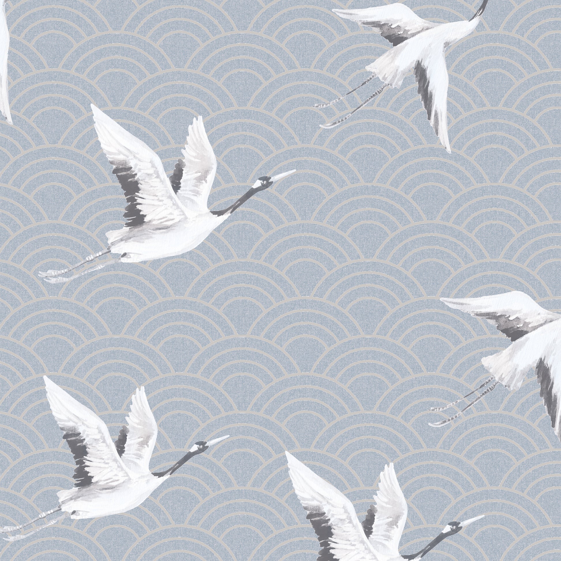 Use:Black and white cranes appear flying across a pearlescent stone blue scalloped background.