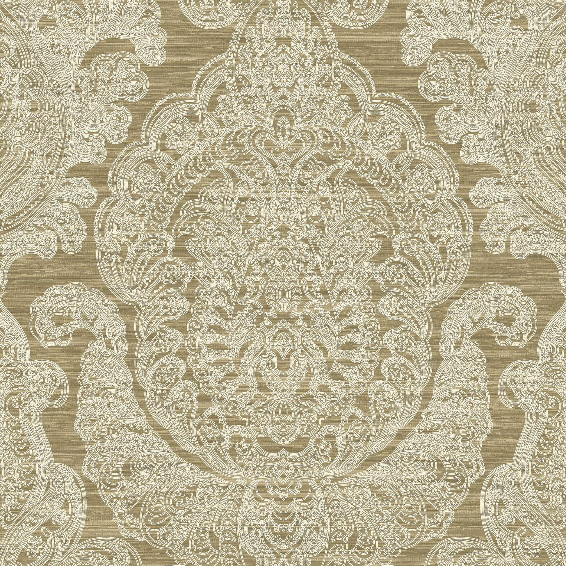 Use:An elegant pearlized damask with intricate white details on a gold striae background.