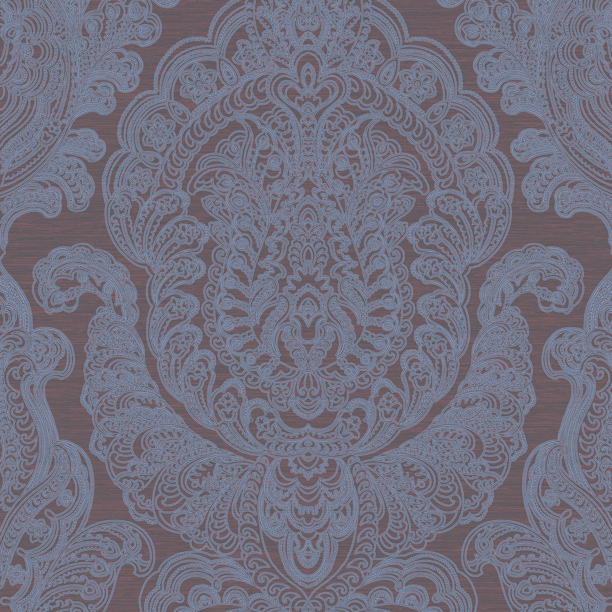 Use:An elegant pearlized damask with intricate silvery, purple details on a burgundy striae background.