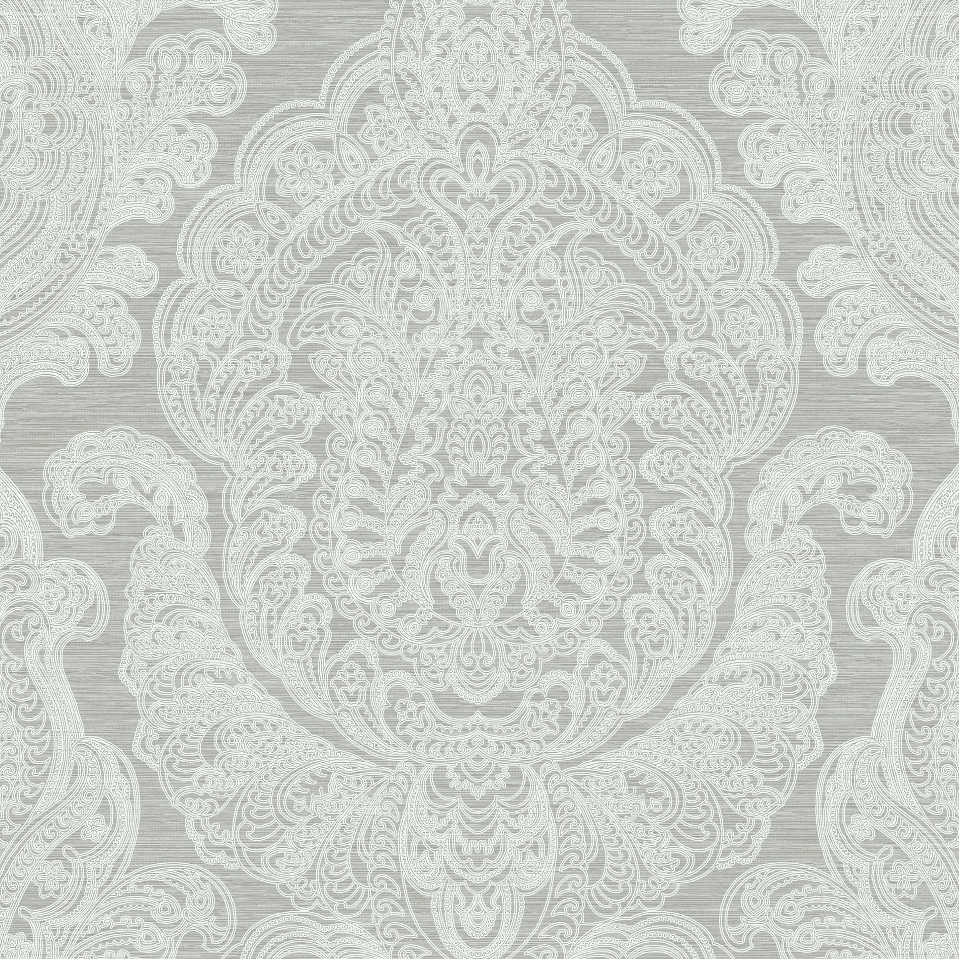 Use:An elegant pearlized damask with intricate silver details on a silver, grey striae background.
