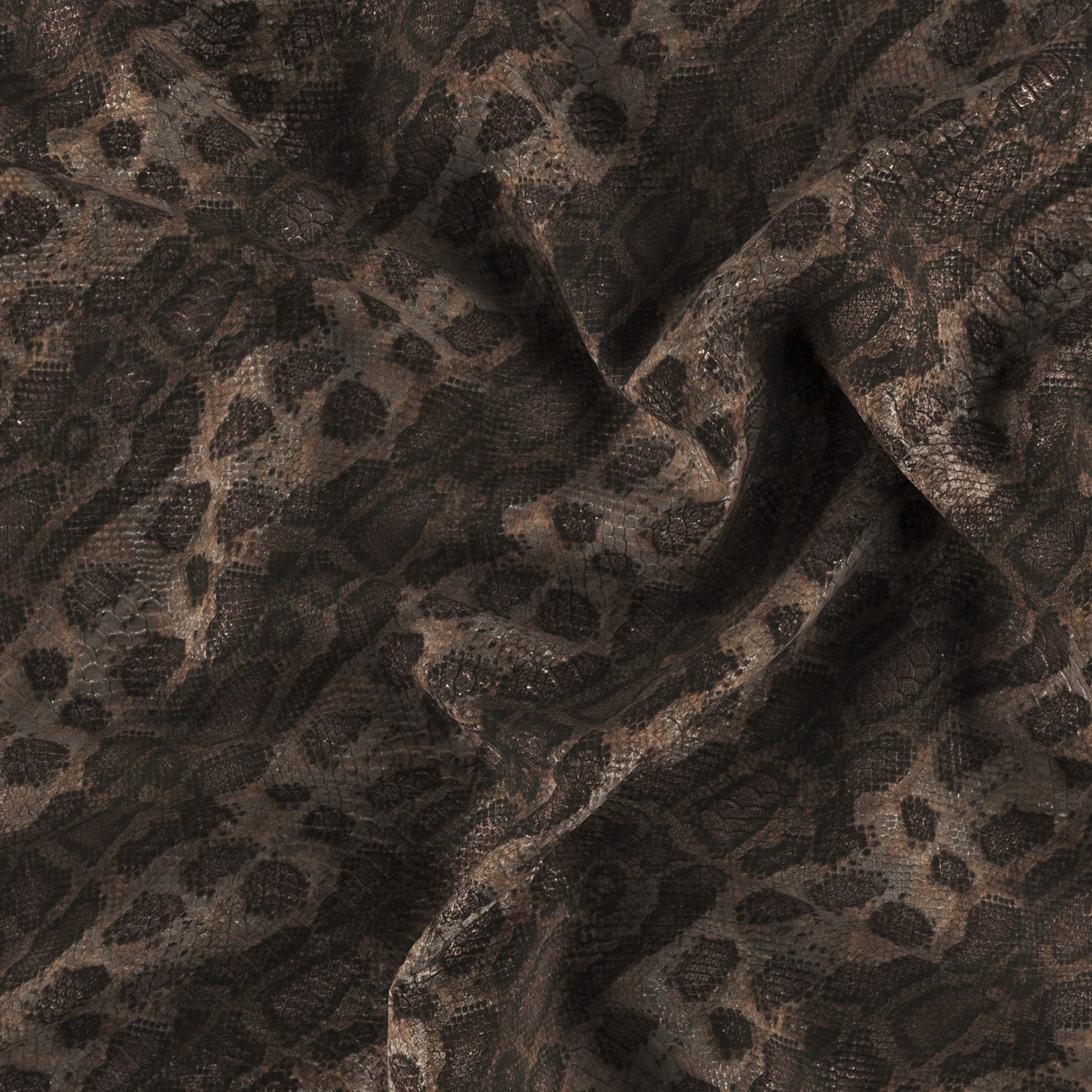 Use:A bold animal print delicately embossed onto metallic vinyl fabric. Brown on taupe, natural background.