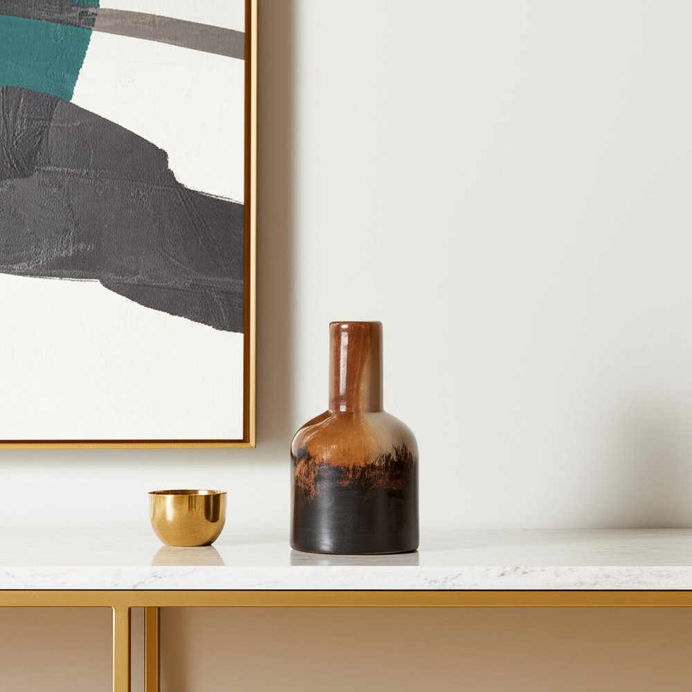 9" Amber Cream And Dark Brown Abstract Tulip Glass Table Vase
