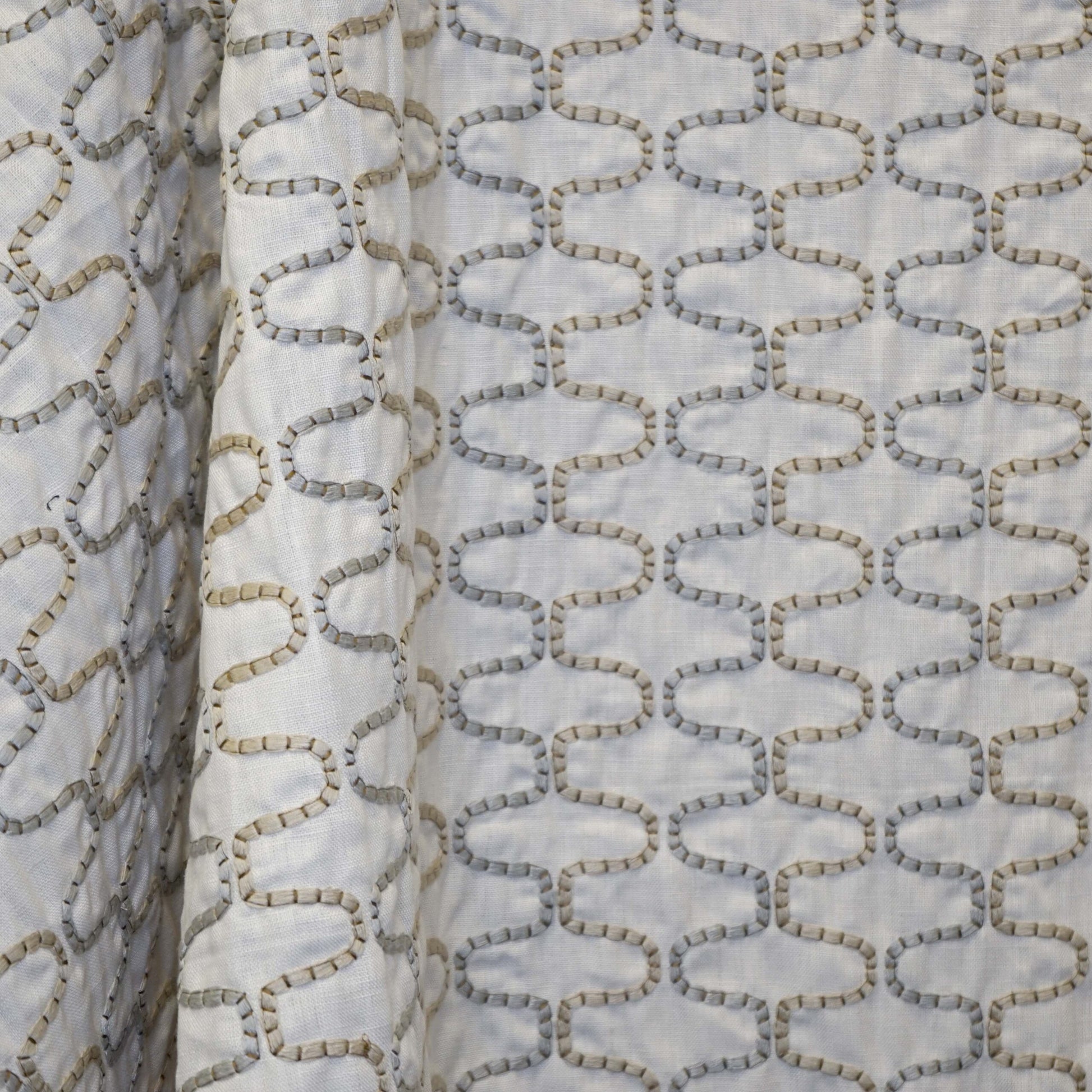 Use:This linen-blend features alluringly wavy two-tone embroidered stripes, which run vertically along the fabric forming an ogee design. The embroidered waves create a goldenrod and grey stripe pattern on a solid beige ground.