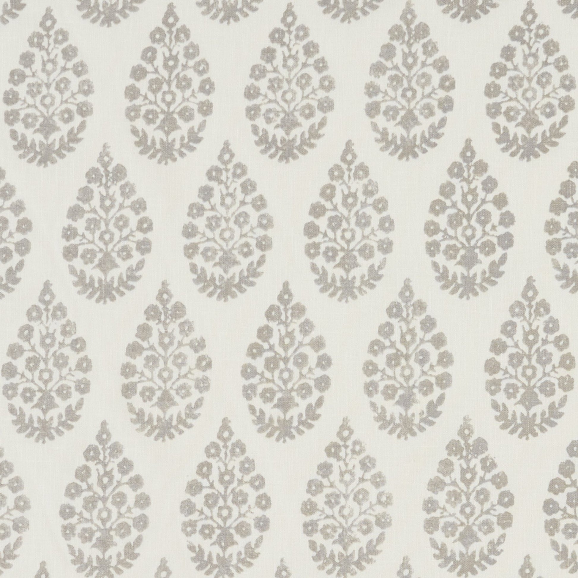 Use:A floral block printed design in the shape of a teardrop creates an updated twist on a traditional pattern. In a soft grey coloration.