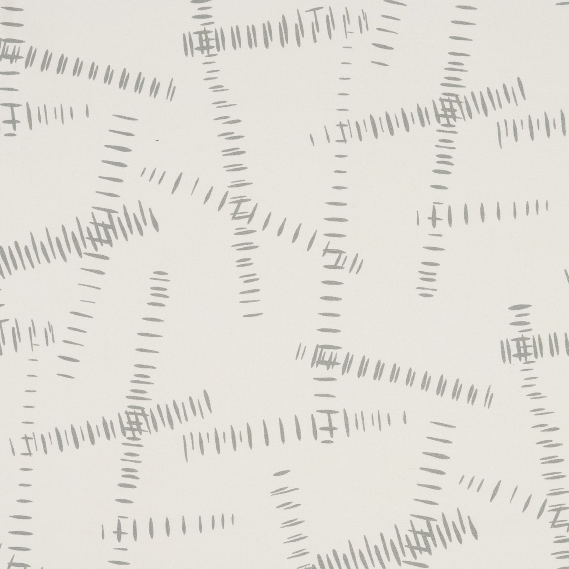 Use:A cool grey abstract print comprised of small dashes creating a stitching appearance on a crisp white base cloth.