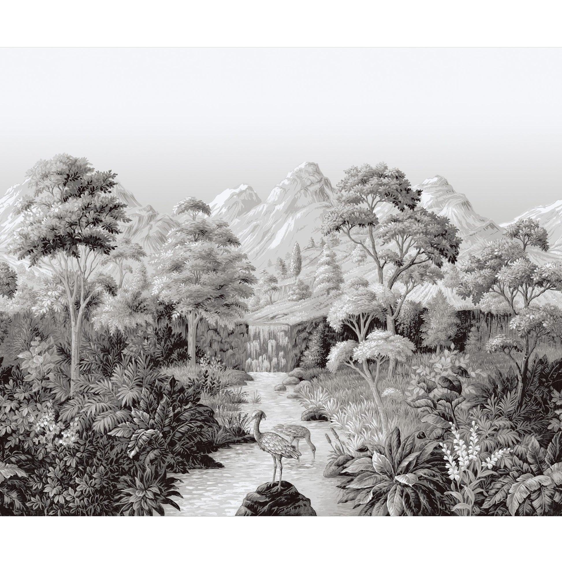 Use:A scenic landscape 6 piece mural of a tropical jungle featuring foliage, mountains and wildlife in different tones of black and grey.