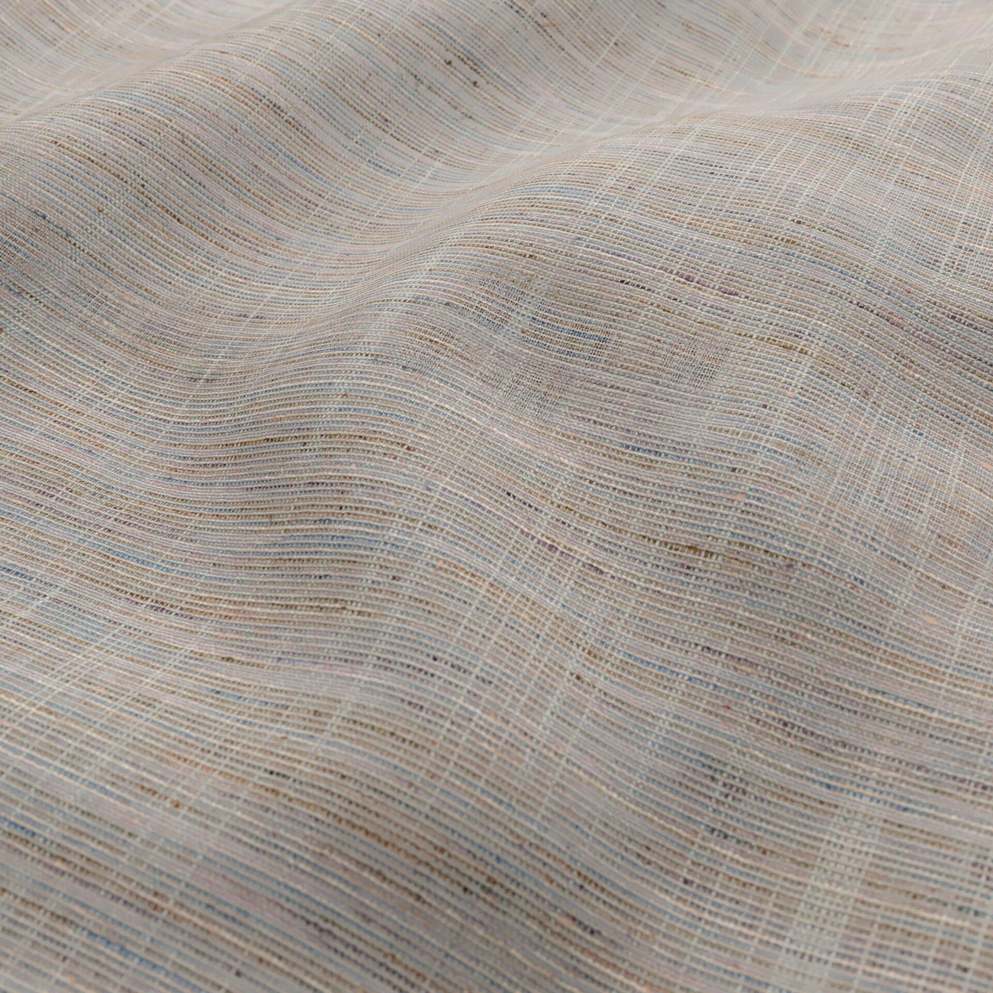 Use:A transitional wide width, recycled polyester sheer in a subtly slubbed in a beige, purple, pink, blue and green coloration.
