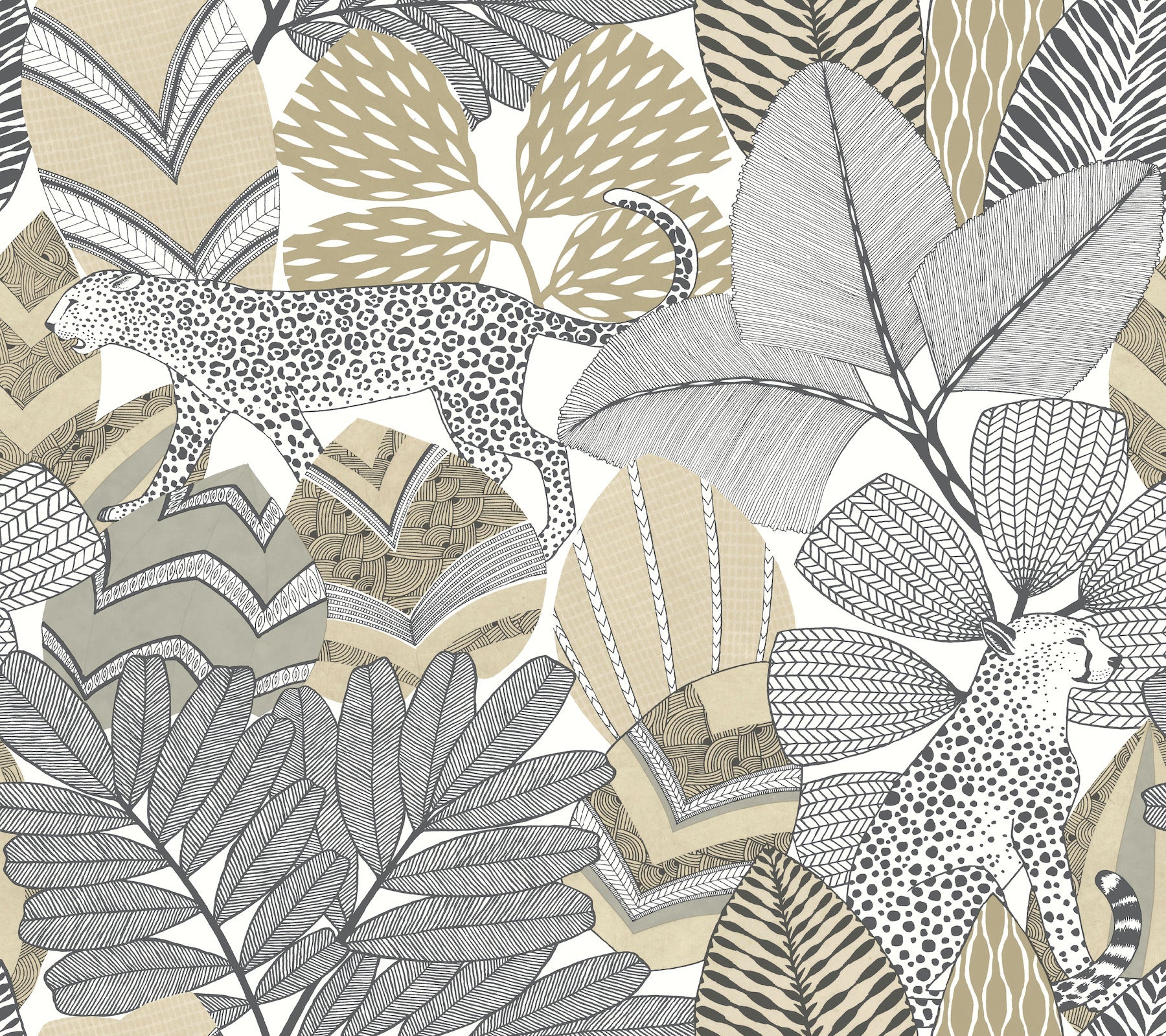 Use:Wildcats prowl through dense, richly patterned foliage in fiercely sophisticated design Namiri. Featured here in a palette of grey, taupe, beige, white and black. This Namiri Wallpaper measures approximately 27 inches wide by 27 feet long, measuring approximately 60.8 square feet per roll. The rich global heritage of timeless relics and hand-crafted naturals are artfully blended in this curated collection of culturally inspired designs.