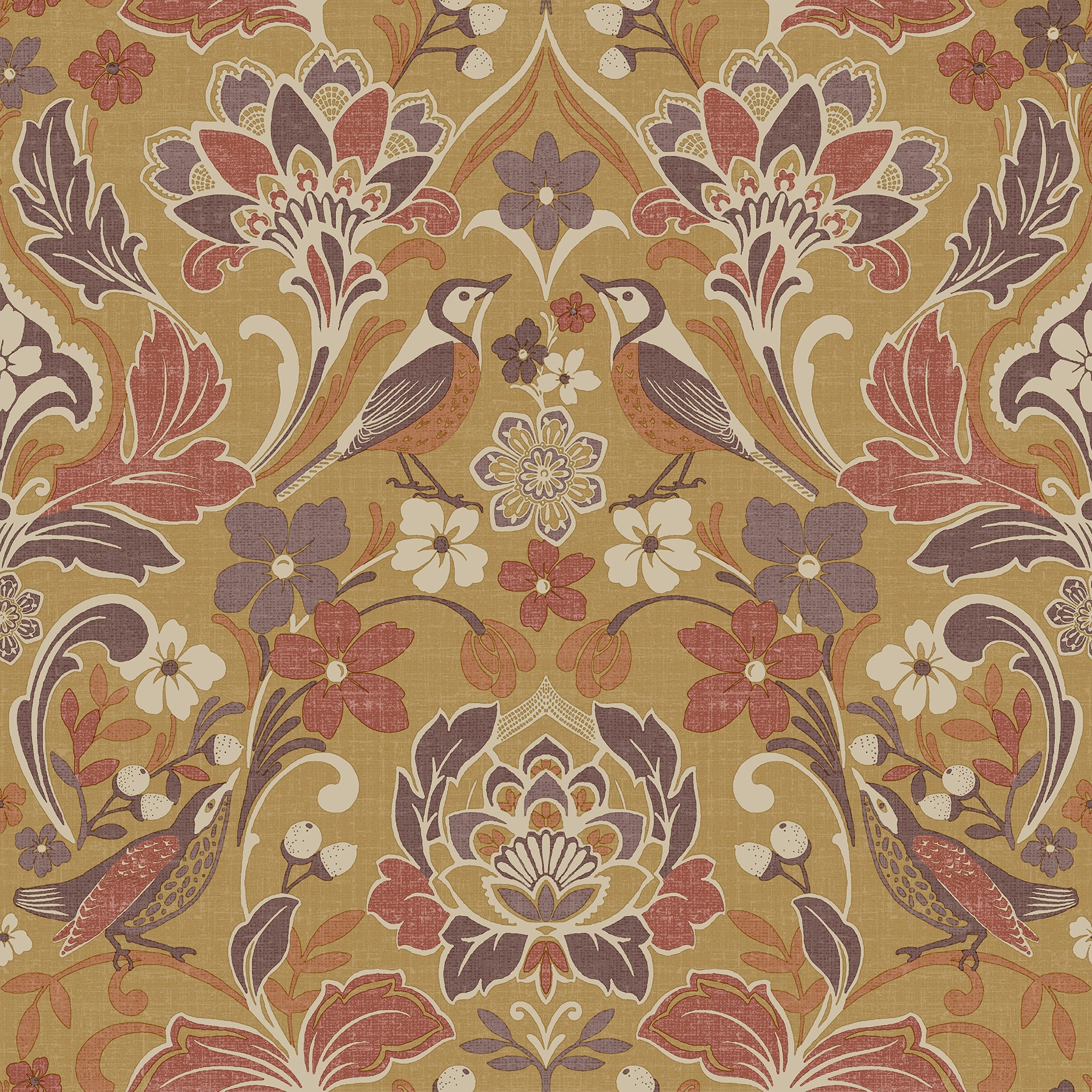 Use:Playful and bursting with vintage flair, this bird and floral wallpaper brings both whimsy and nostalgia to your home. Nuthatches and chickadees visit a variety of flowers and woodland plants that form a botanical-forward damask design. Seen here in shades of mustard, plum, raspberry, tangerine, and cream. Birdy is an unpasted, non woven wallpaper measuring 20.9 inches wide by 33 feet long, covering approximately 57.5 square feet per roll. Unpasted non woven material; 20.9-in repeat, straight match; Washable and strippable; 20.9-in by 33-ft long roll; Covers about 57.5 square feet