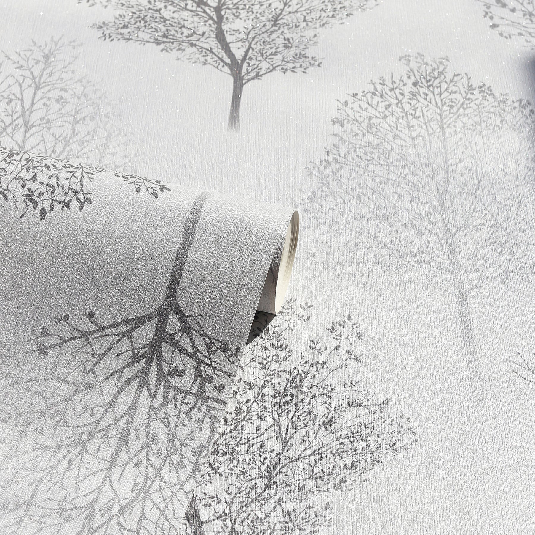 Use:Adorn your walls in the serenity of this woodland print. The wallpaper features silhouettes of trees with spindly, leaf-laden branches in grey and metallic silver against a pale grey backdrop, all finished with a subtle layer of silver glitter. Agatha is an unpasted, vinyl coated paper wallpaper measuring 20.9 inches wide by 33 feet long, covering approximately 57.5 square feet per roll. Unpasted vinyl coated paper material; 20.9-in repeat, drop match; Scrubbable and peelable; 20.9-in by 33-ft long roll; Covers about 57.5 square feet