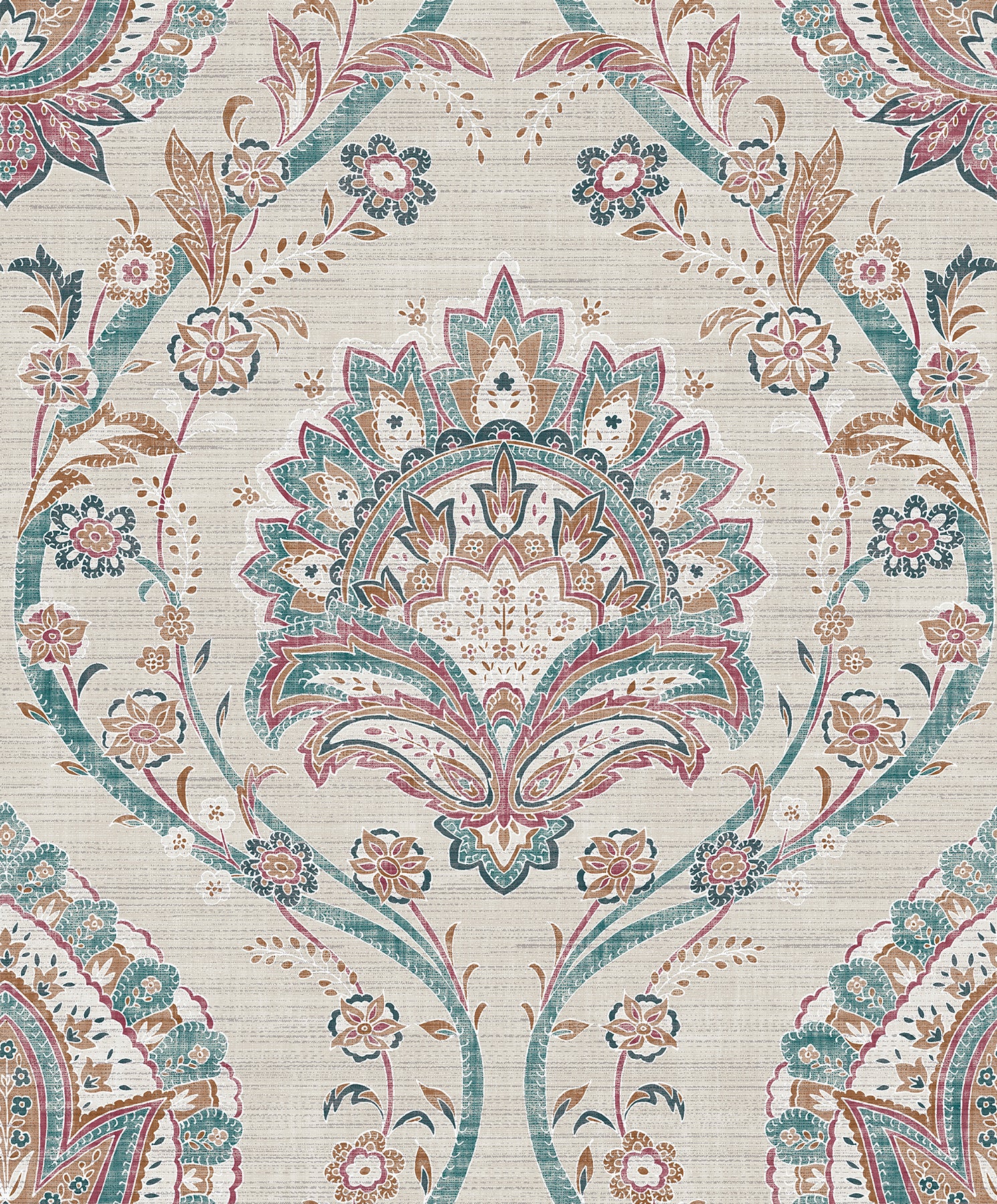 Use:Bring bohemian sophistication to your walls with this stunning wallpaper. The design combines Jacobean florals with a damask structure and elevates it further with a backdrop enhanced by textural details. Featured here in rich teal, raspberry, rust, navy, and white against beige. Teigen is an unpasted, vinyl coated paper wallpaper measuring 20.9 inches wide by 33 feet long, covering approximately 57.5 square feet per roll. Unpasted vinyl coated paper material; 25.2-in repeat, straight match; Scrubbable and peelable; 20.9-in by 33-ft long roll; Covers about 57.5 square feet