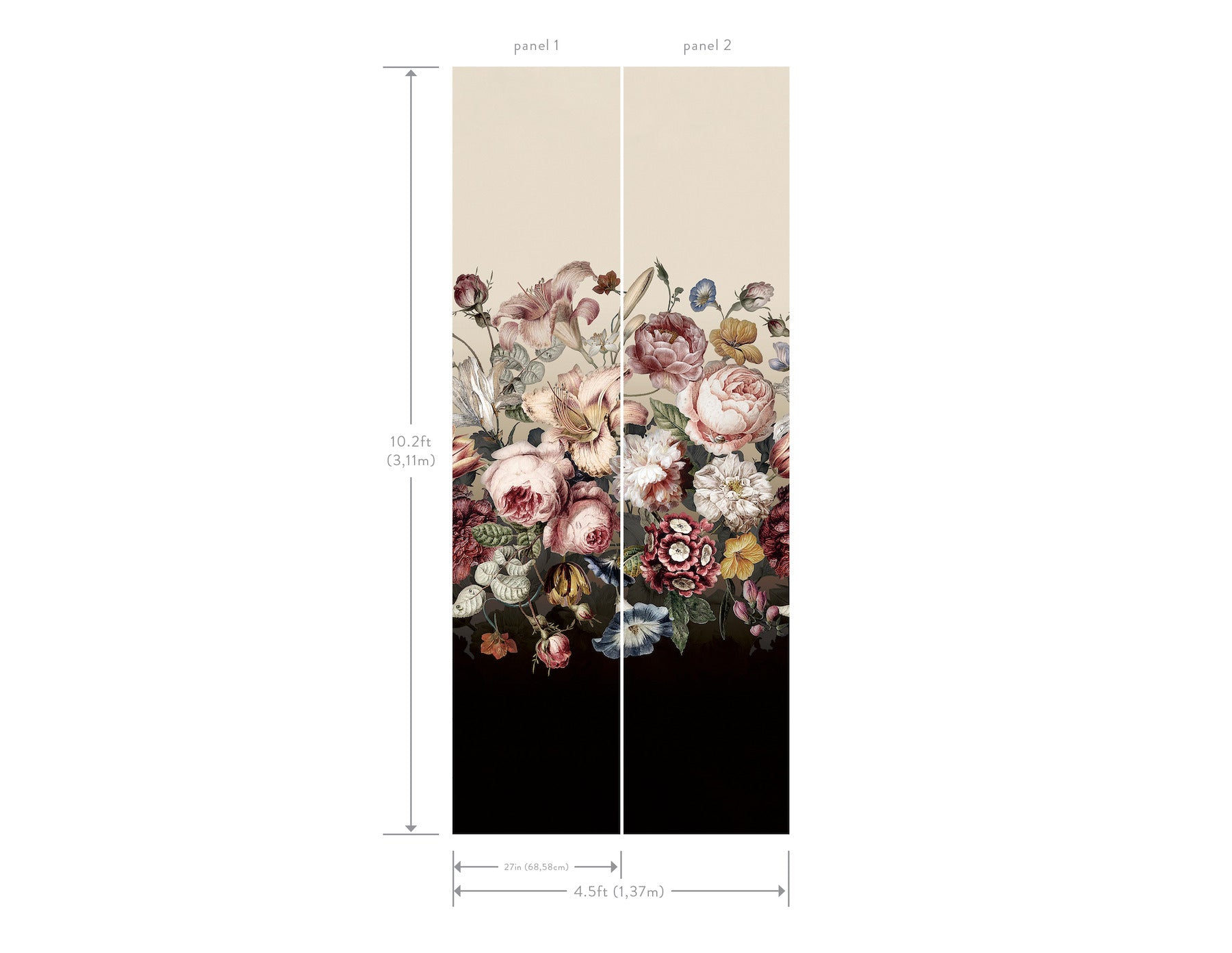 Use:A burgeoning bouquet sits in the middle of light and dark poles in pattern Rachel Rose Mural featured in pinks, black, and neutrals. This Rachel Rose Mural measures approximately 54 inches wide by 10.2 feet long, measuring approximately 4.5-ft wide by 10.2-ft long when assembled. Florals speak the language of ever-evolving style with instant connection and iconic form that confidently compliments any space and every design signature.