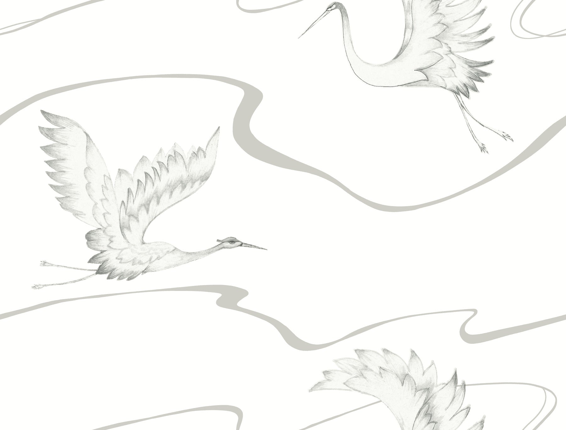 Pattern: BW3873 / Soaring Cranes White and Silver Wallpaper