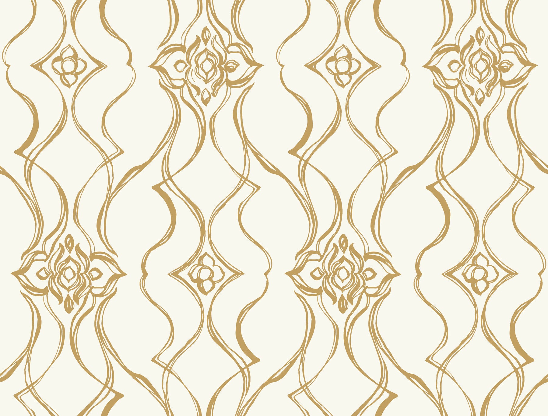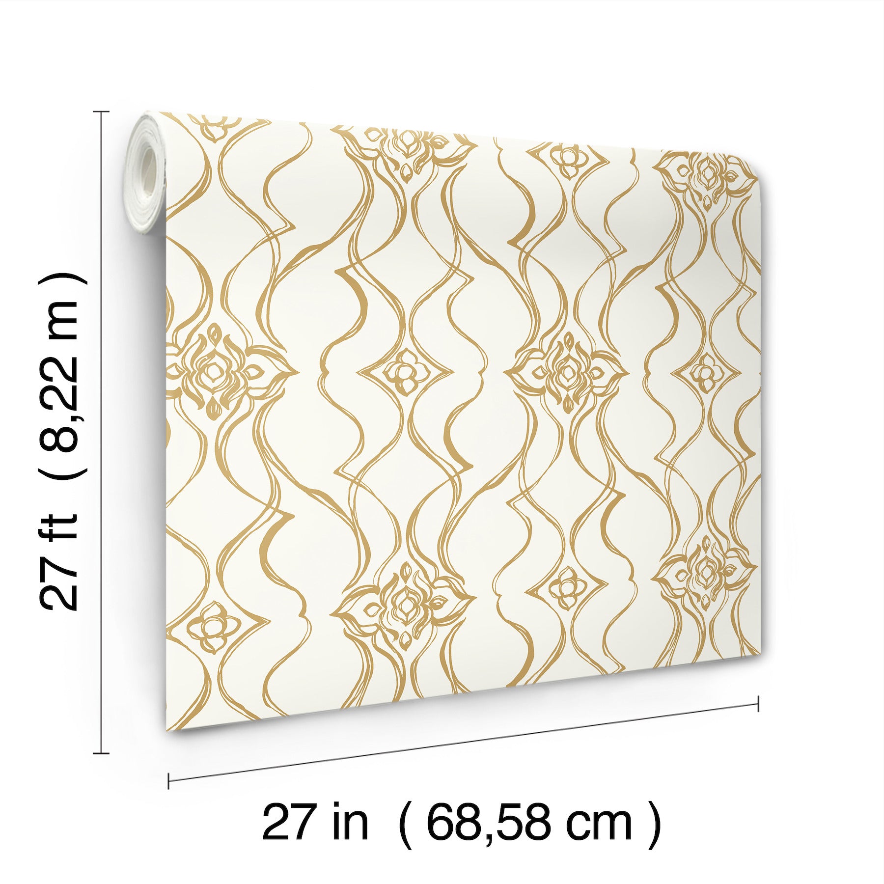Use:The stylized sketched damask Pirouette dances and spins a classic design into contemporary artistic motion with a glamourous touch of sparkling metallic, featured here in white with gold. This Pirouette Wallpaper measures approximately 27 inches wide by 27 feet long, measuring approximately 60.8 square feet per roll. Candice Olson?s signature aesthetic defines timeless modern style. Decadence Second Edition features a gallery of glamorous specialty and luminous metallics dedicated to luxury living.