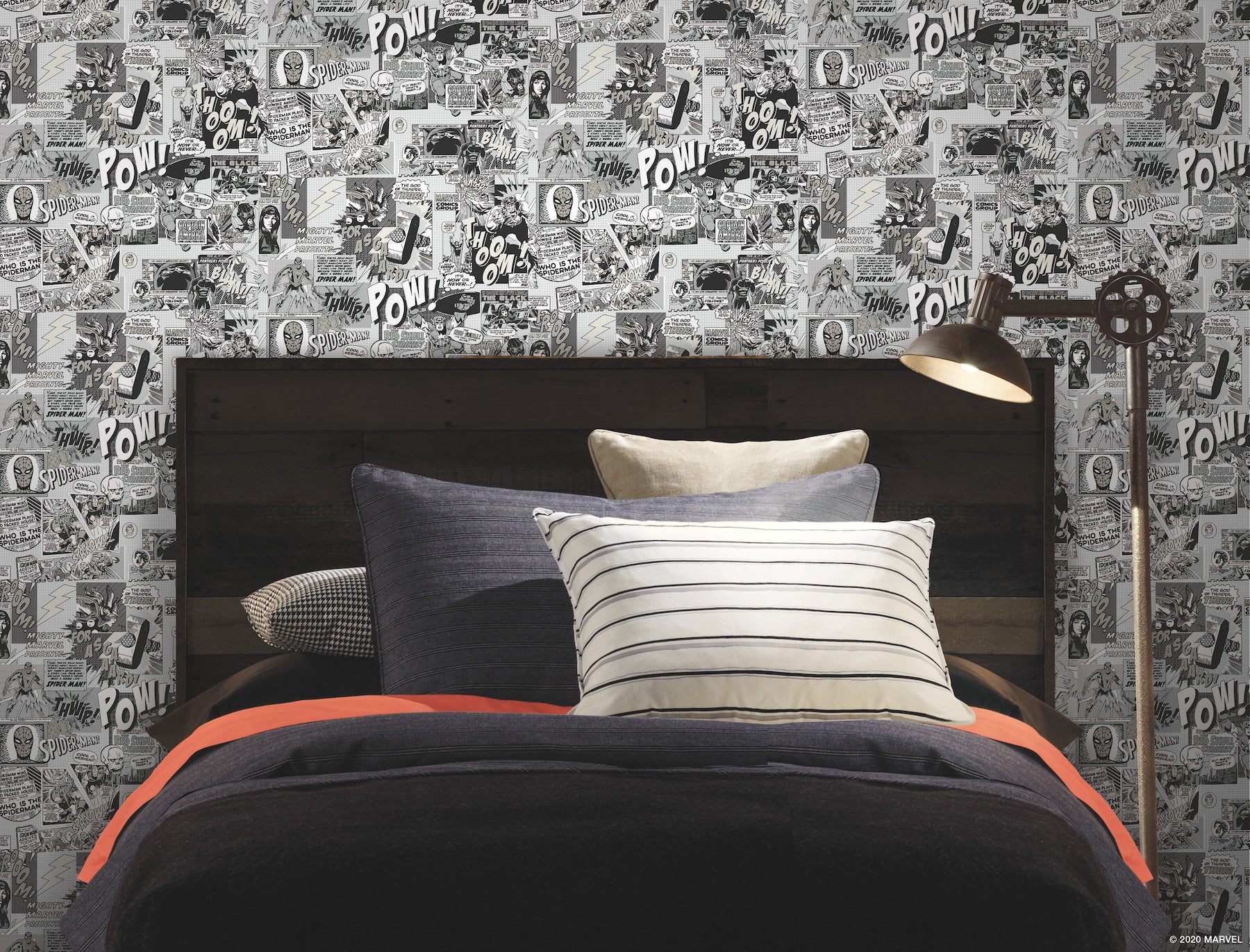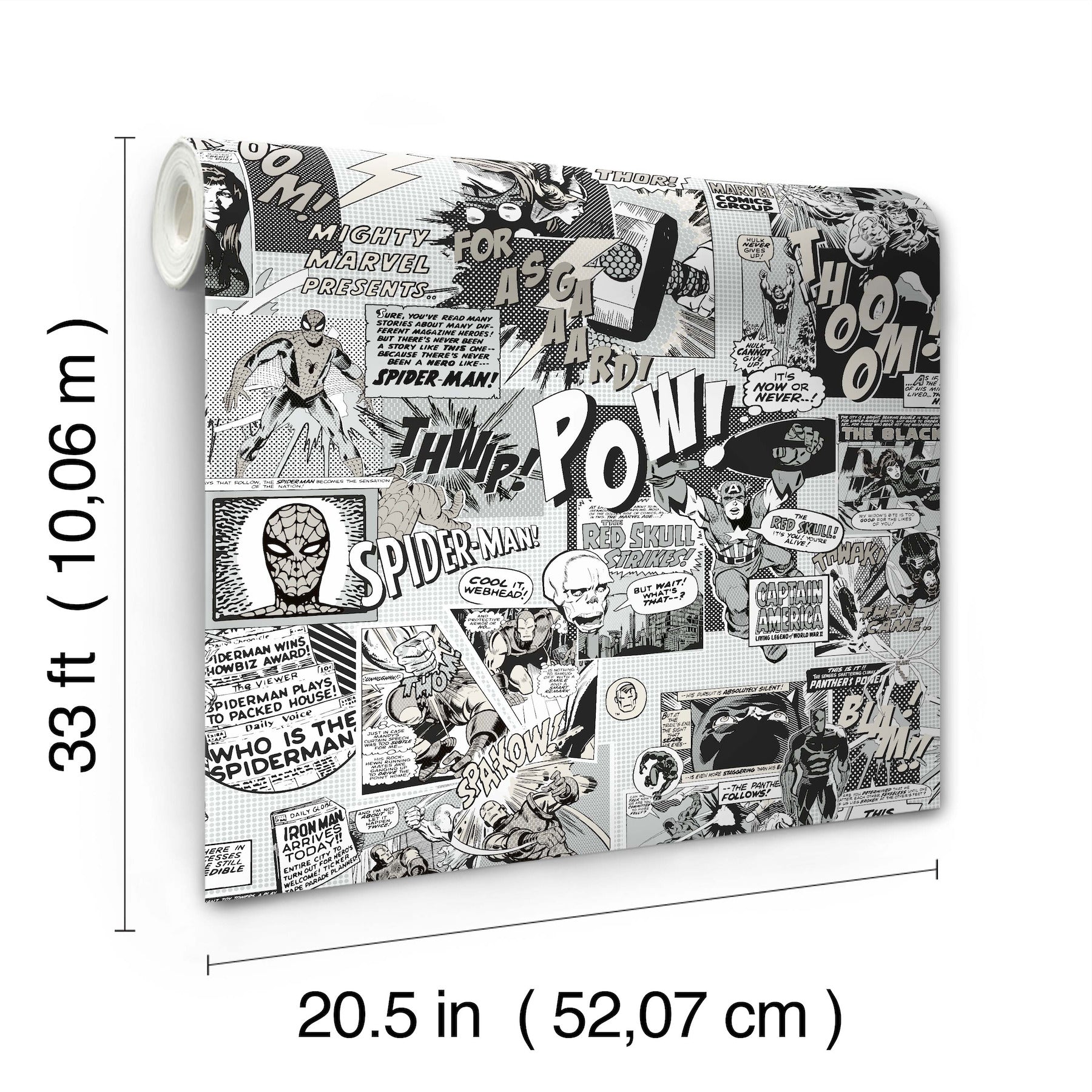 Use:This colorful pattern is sure to add high impact to your kids space. This Marvel Comics Pow! Wallpaper measures approximately 20.5 inches wide by 33 feet long, covering About 56.4 square feet per roll. Durable and easy to remove from primed walls, this friendly to hang unpasted nonwoven wallpaper is created with a special blend of synthetic fibers, making it both easy to hang and tear resistant.