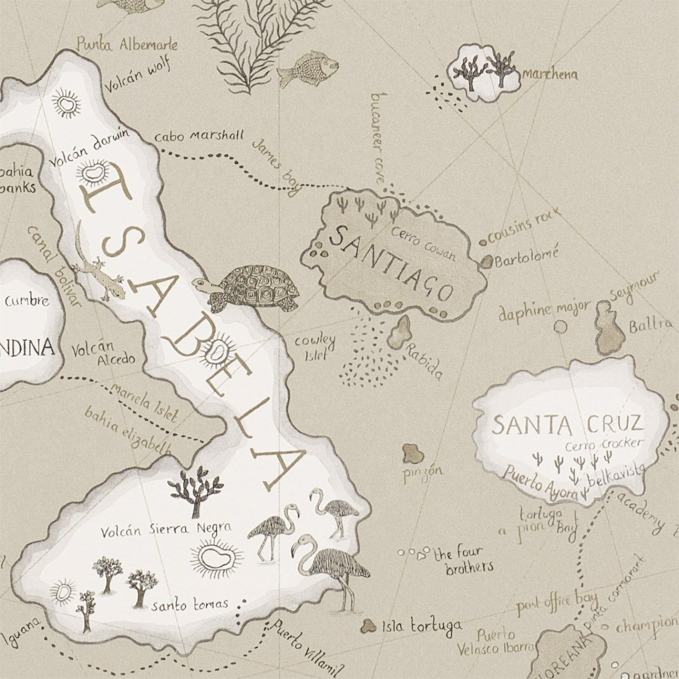 Use:Galapagos depicts a vintage map of Darwins famous archipelago. This is however no ordinary map; upon closer inspection it comes to life with whimsical paintings of the islands wildlife and marine life. This design is also available as a printed fabric in