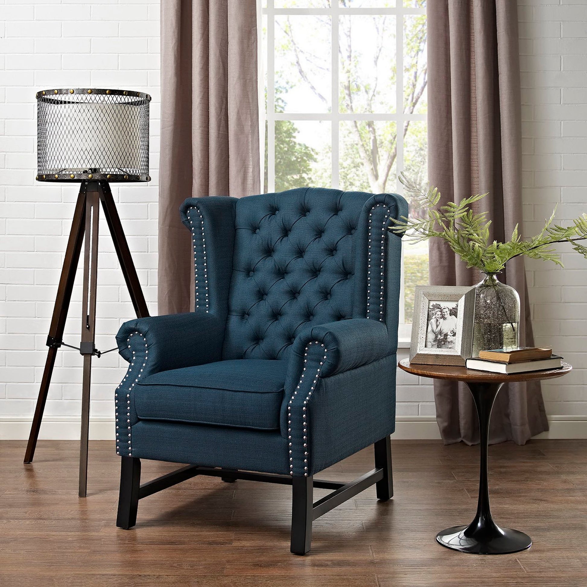 Use:Enrich your leisure time with the Steer Armchair. Luxuriously tufted buttonswith ornately rolled armrests and back featuring elegant nailhead trim, Steer makes it easy to chart the course through many enjoyable living or lounge room excursions. Exquisitely upholstered in finely upholstered polyester, dense foam padding, and black stained wood legs, Steer works well in vintage, rustic, cabin, contemporary, global, and other eclectic spaces.,Fine Polyester Upholstery