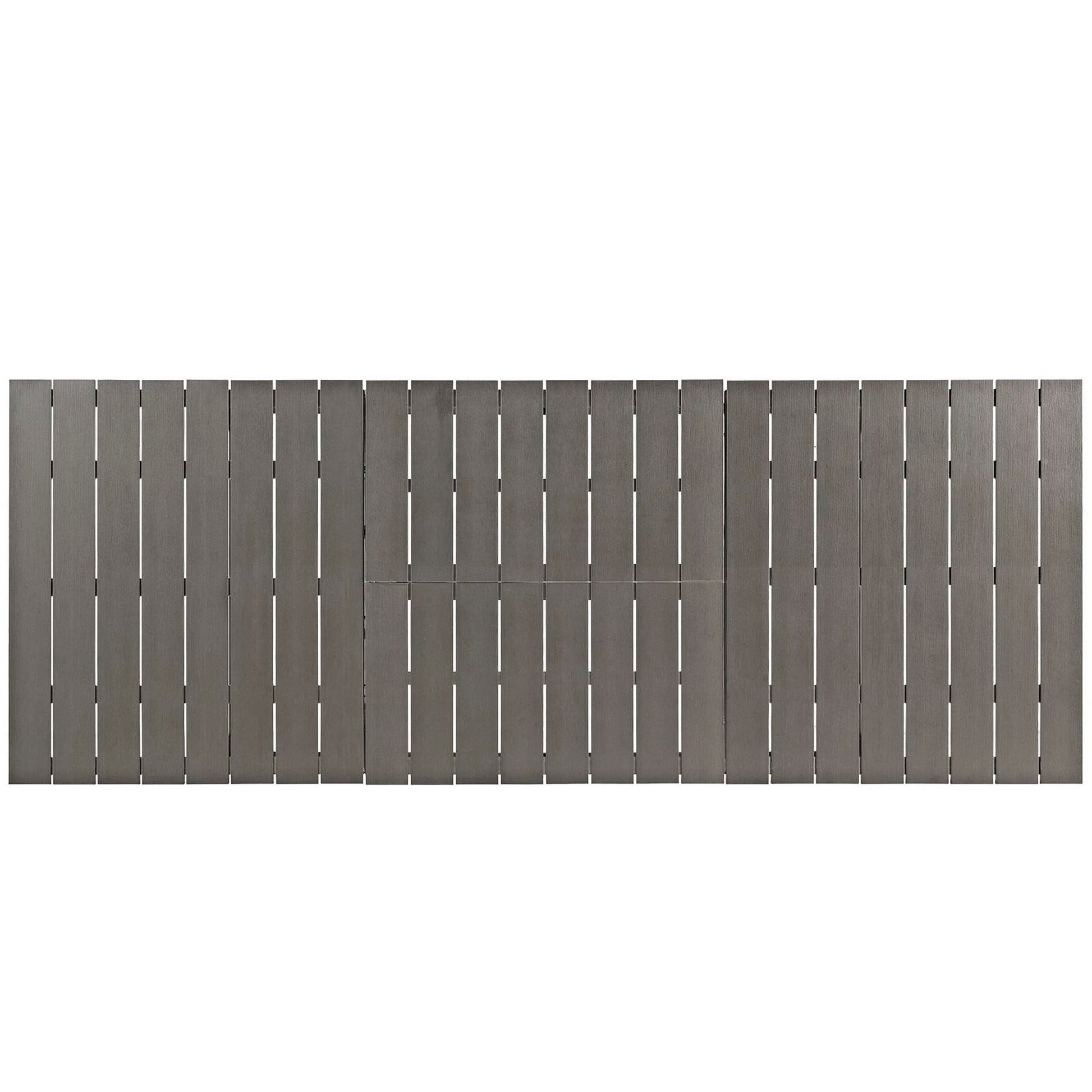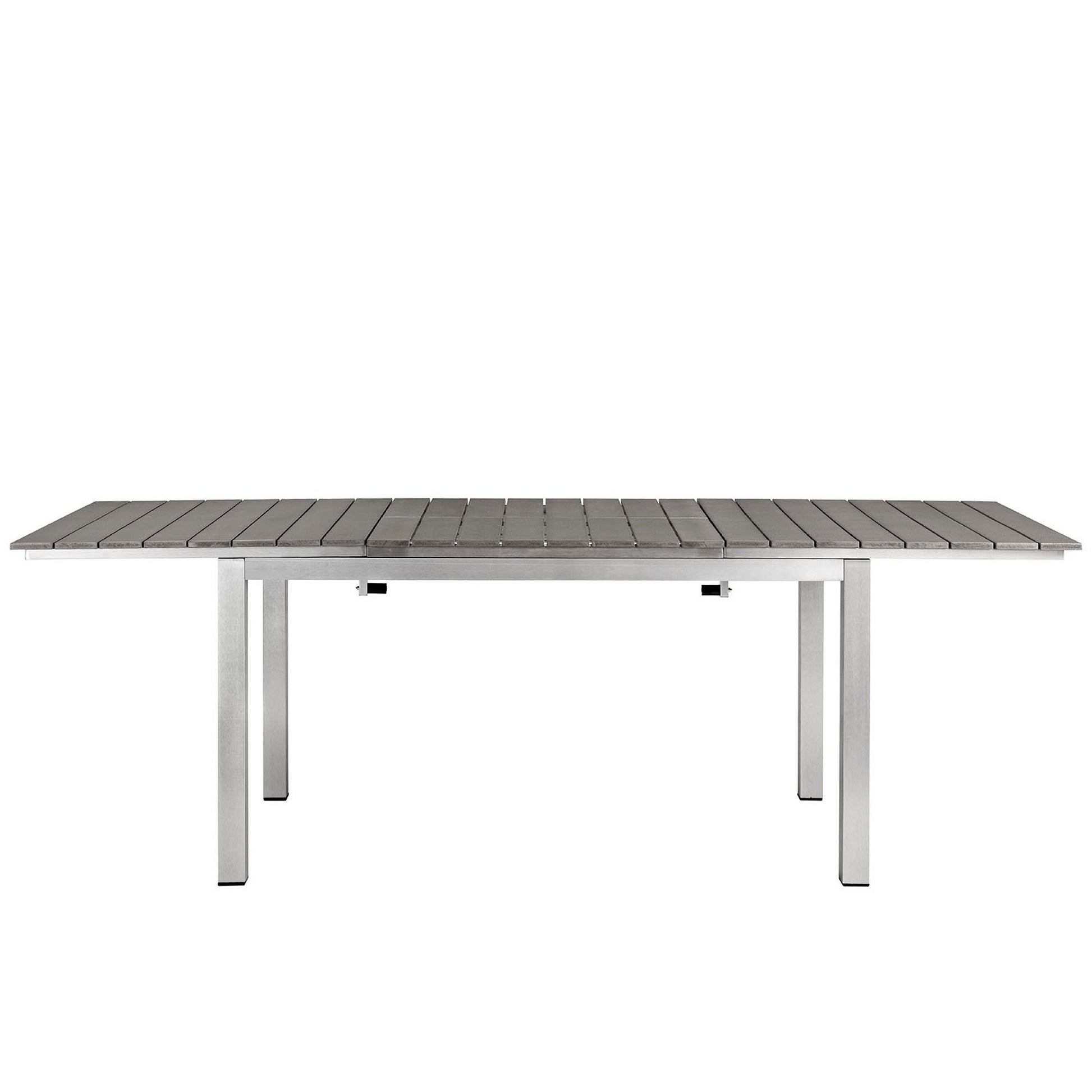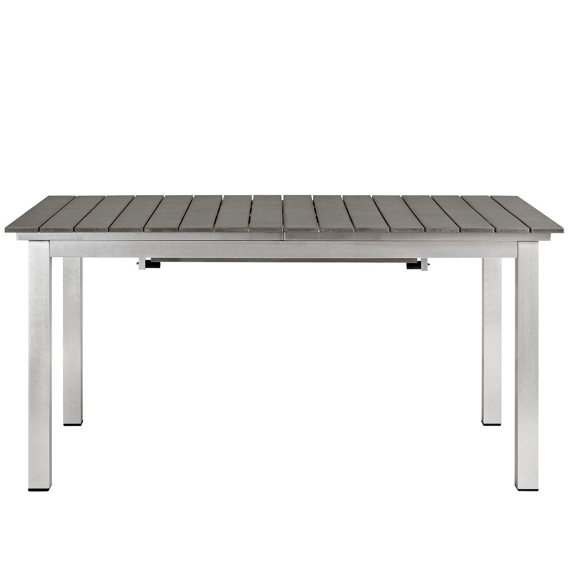 Use:Enjoy your patio or backyard leisure time with the strong and durable Shore Outdoor Patio Aluminum Extension Dining Table. Made with an anodized brushed aluminum frame and non-marking black plastic foot caps, Shore Patio Dining Table features tone-on-tone grays with wood accents on the paneling for a chic and minimalist look. Easily collapse the center panel and fold safely underneath, or extend to full size, with the versatile Shore Outdoor Dining Table.,Outdoor Extension Dining Table