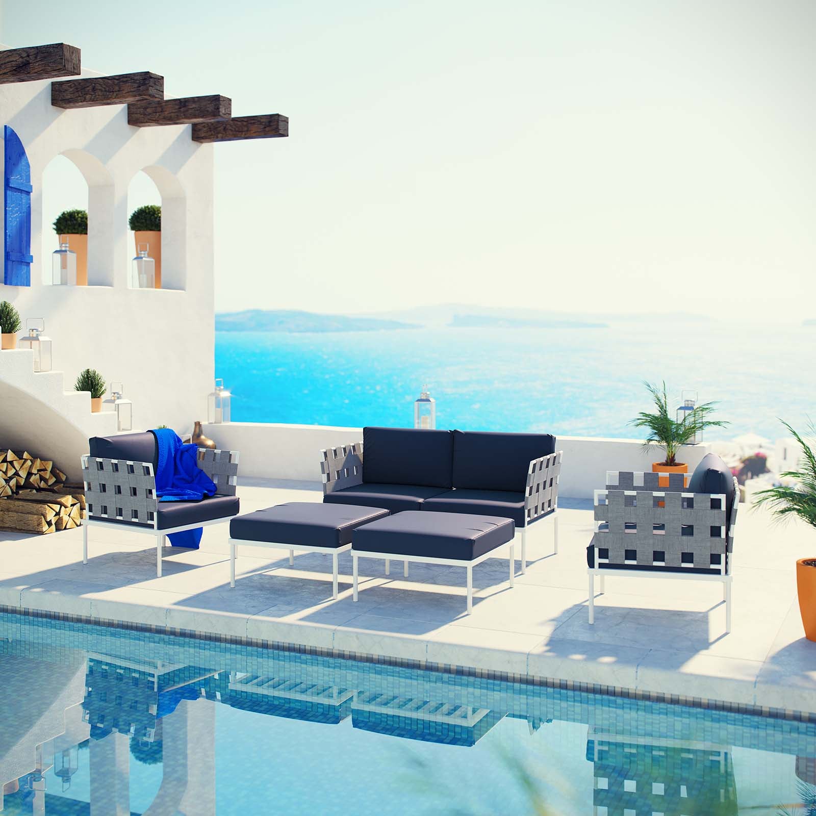 Modway Outlet Harmony 5 Piece Outdoor Patio Aluminum Sectional Sofa Set by Modway Outdoor Furniture Furniture White Navy - EEI-2621-WHI-NAV-SET