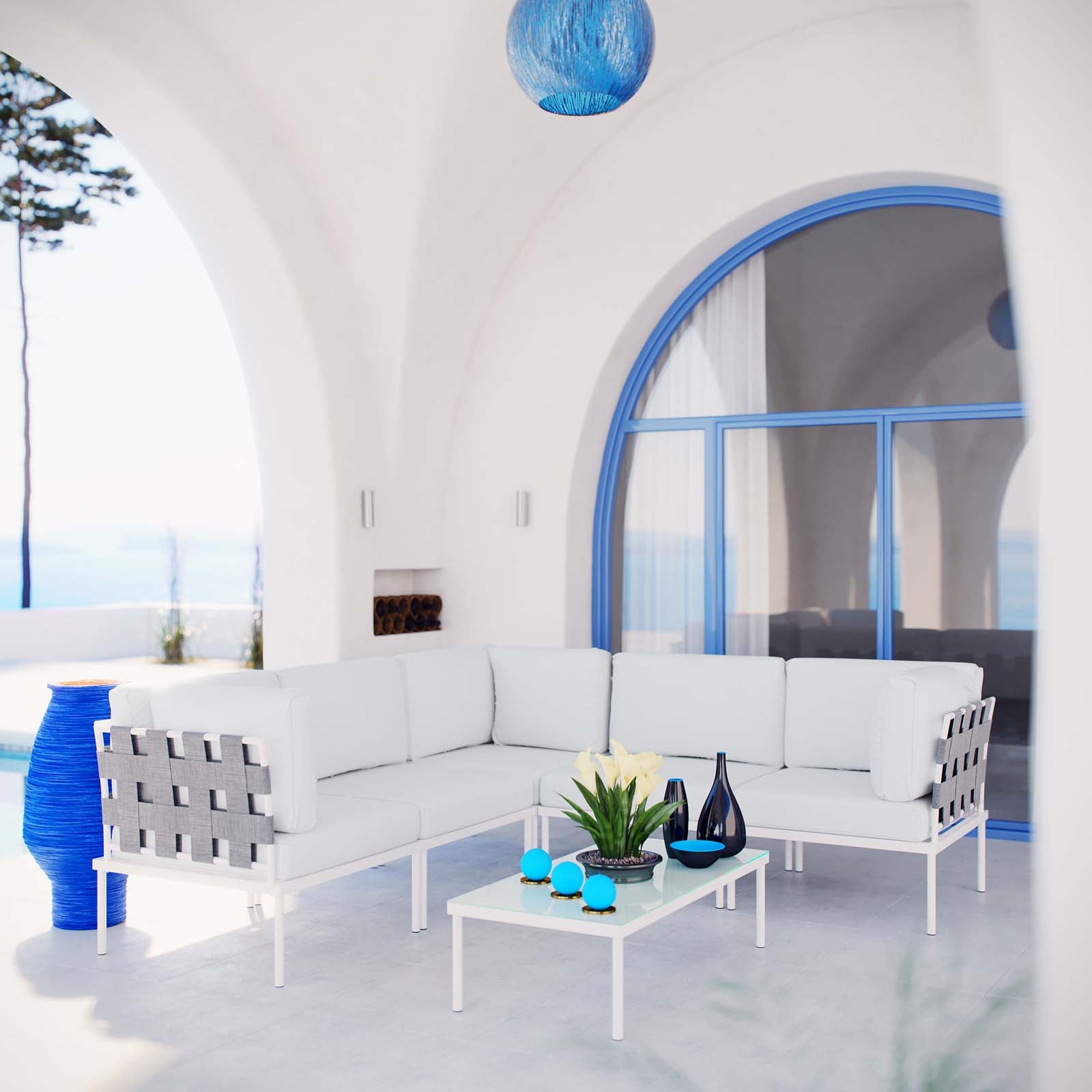 Use:Engage life with Harmony Outdoor Patio Sectional Sofa Furniture Set. Enjoy casual conversation under the open sky with an all-weather waterproof furniture set that delivers an exceptional outdoor porch, patio, balcony or garden experience. An exceptional modern patio furniture set that exceeds expectations, this Harmony Outdoor Sectional set comes with long-lasting machine washable cushions, silk polyester seat back weave, square powder coated aluminum bases, tempered glass top tables, and non-marking foot caps. A sectional sofa that arranges according to the spontaneous needs of your guests, set your sights on open and inspired moments with the Harmony Outdoor Patio Collection.,All-Weather Canvas Fabric