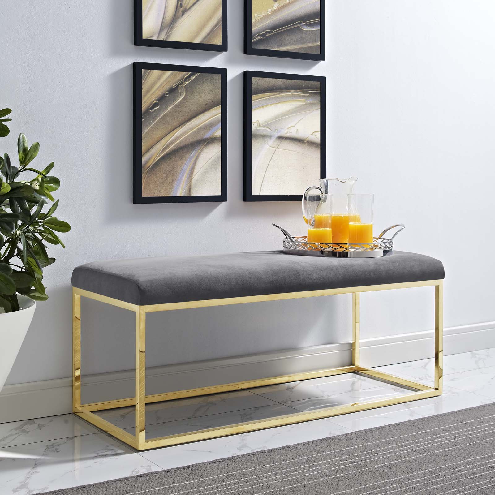 Use:Make a statement with Anticipate. Brimming with clean lines and a sleek modern look, Anticipate features a polished stainless steel base, elegant velvet polyester fabric top, and non-marking foot caps that help protect your flooring. The perfect addition to your bedroom, living space or entryway, Anticipate is a versatile bench that combines comfort and style with a supportive seat cushion and weight capacity up to 331 lbs. No assembly required.,Modern Bed Or Living Room Bench