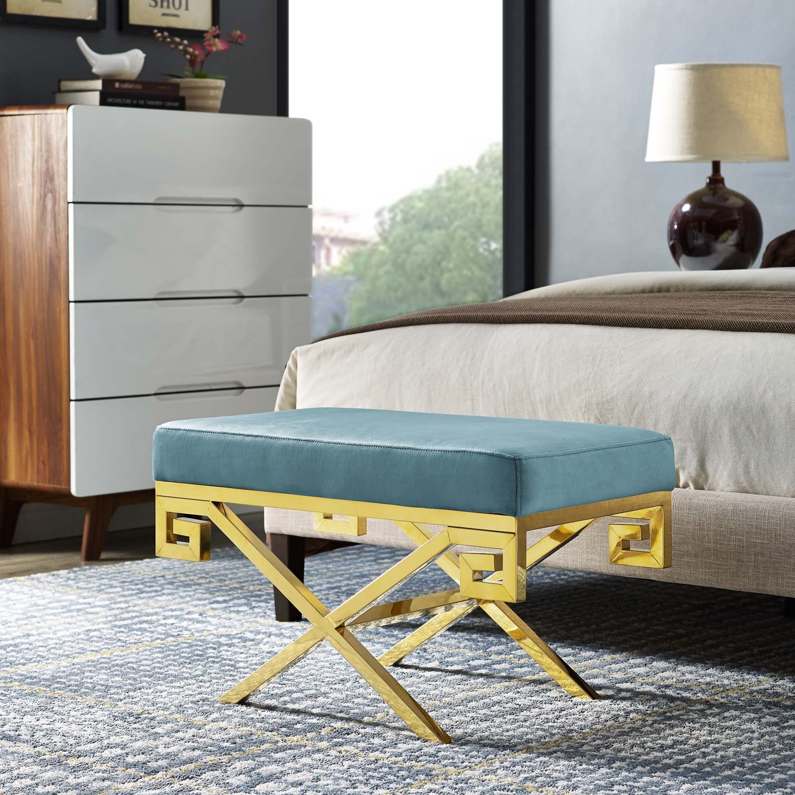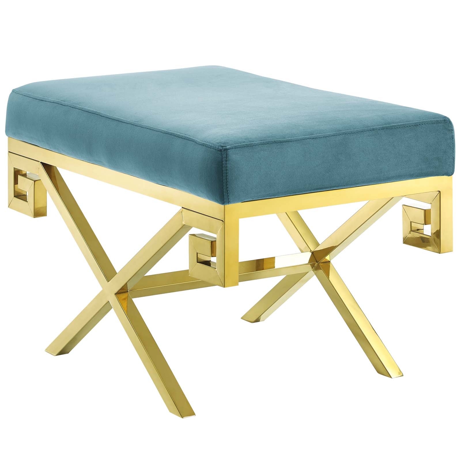 Use:Embrace modern whimsy with Rove Performace Velvet Accent Bench. Brimming with energy and a sleek modern look, Rove features a polished gold stainless steel base with a Greek Key design, dense foam padding, and a soft stain-resistant performance velvet polyester upholstered top. A striking statement piece in the living room, bedroom or lounge area, Rove can support up to 331 pounds and comes with foot pads to help protect your flooring.,Modern Bedroom or Living Room Bench