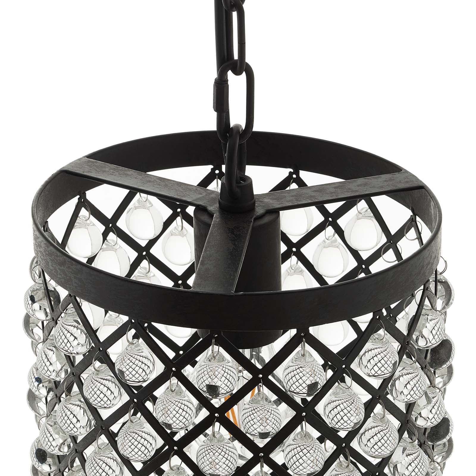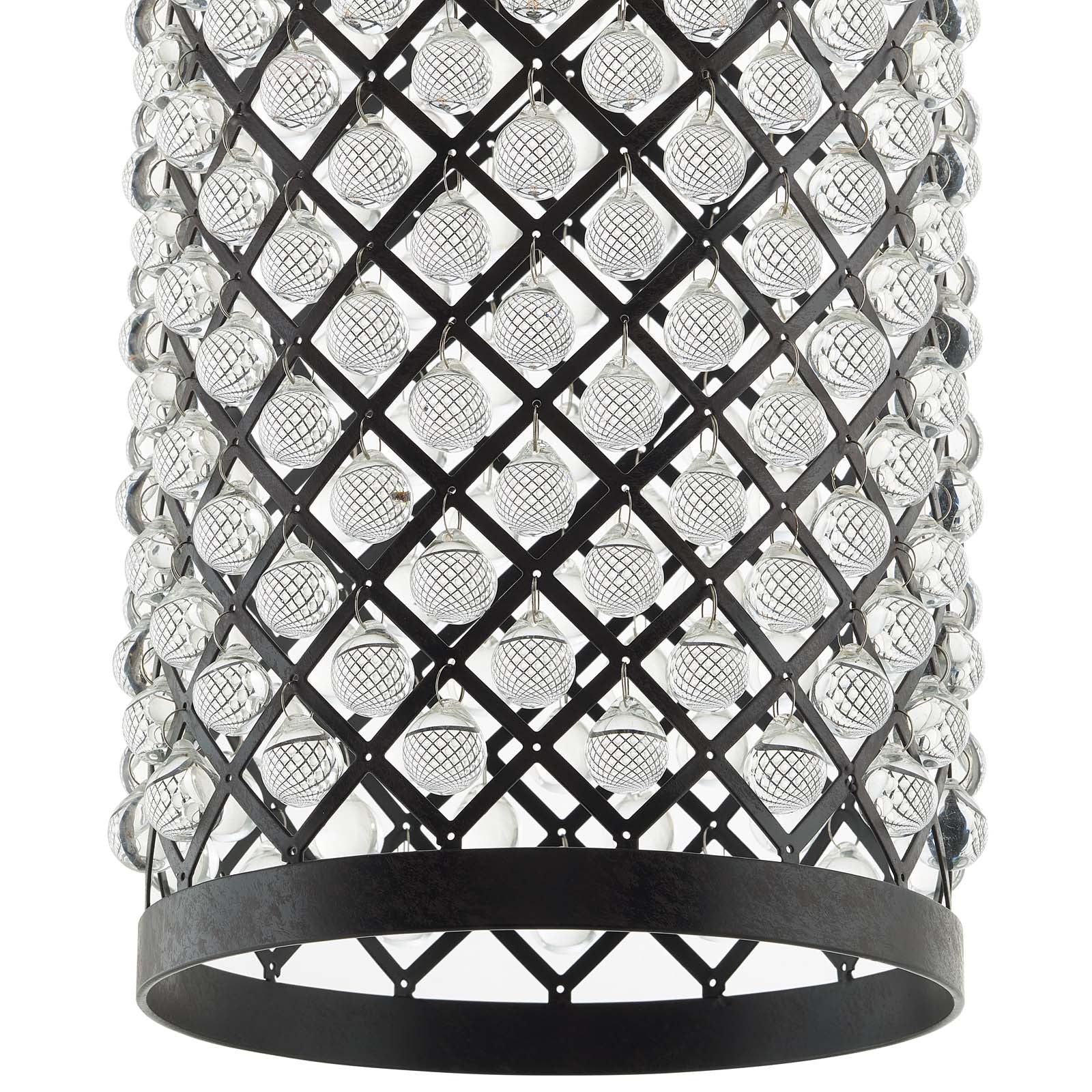 Use:Elevate and illuminate your decor with Reflect, an artful pendant chandelier with a blend of rustic intrigue and contemporary elegance. A dazzling addition above the dining room table or in an entryway, this cylindrical-shaped metal pendant is accentuated by a distressed black lacquer finish, which alluringly complements the glass beads hung in each diamond cut out. Requires one E26 60W bulb (not included).,Cylindrical Pendant Chandelier