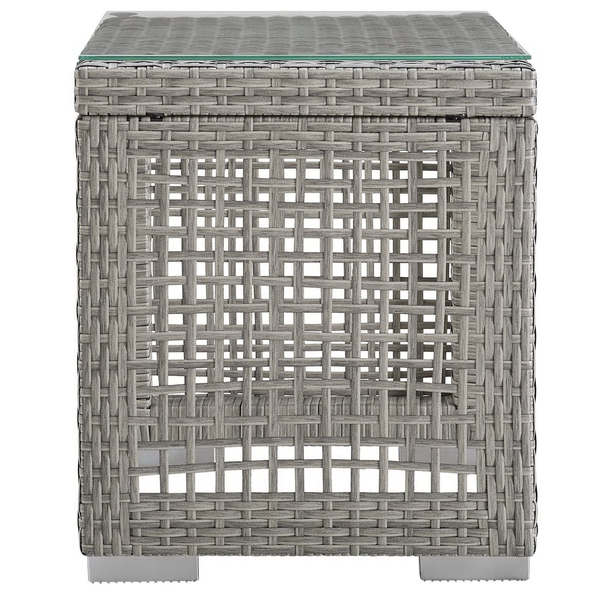 Use:Weave conversational threads into a rollicking good time with Aura Outdoor Patio Side End Table. Aura is a patio side end table that comes with a synthetic gray-on-gray tone wicker rattan weave and a powder-coated aluminum frame that delivers a softly versatile outdoor collection that shifts to meet the needs of the moment. Complete with non-marking foot caps and a tempered glass top, Aura Outdoor Side Table will make your outdoor spot the focal point of good memories and festive gatherings while enhancing your patio, backyard or poolside arena.