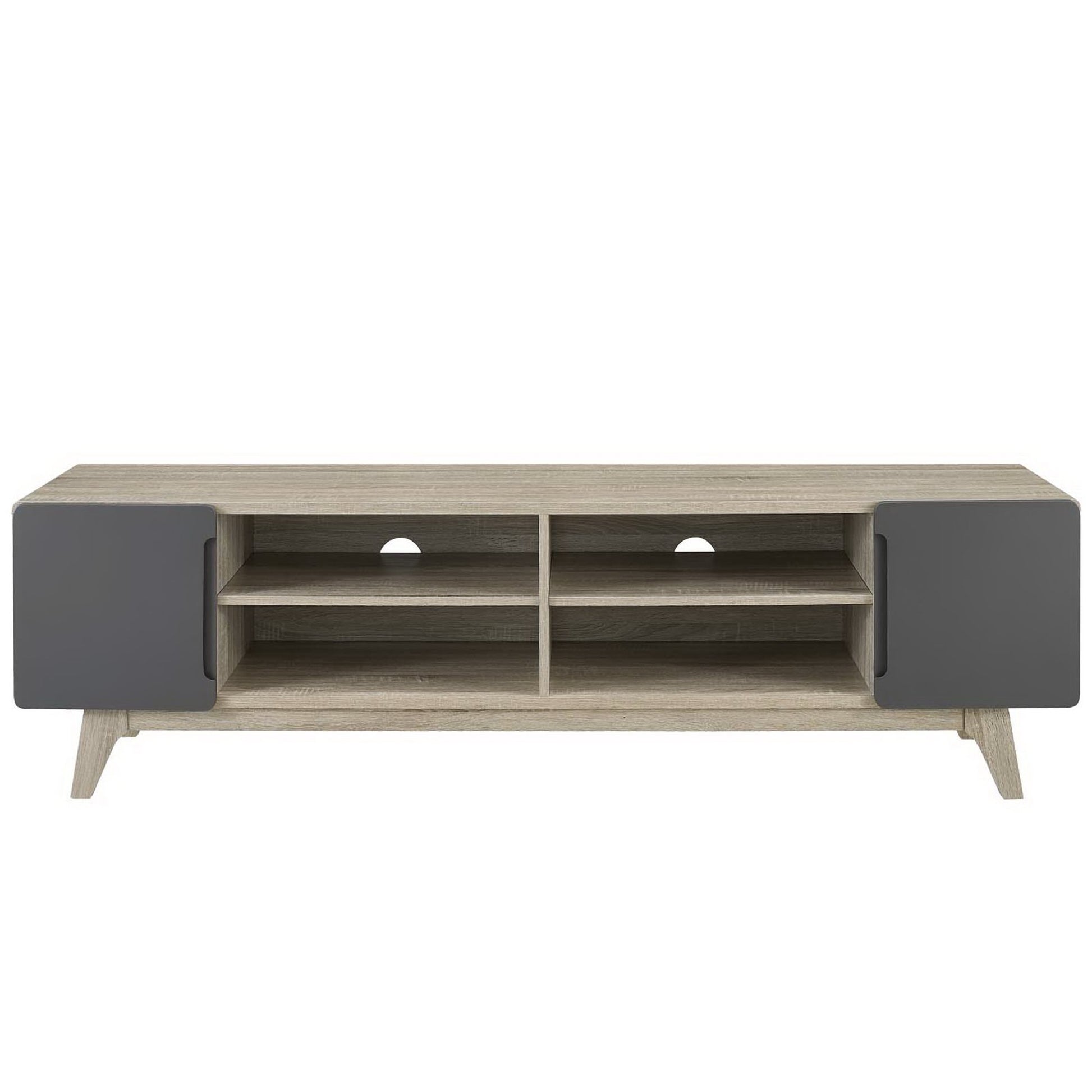 Use:Activate the charismatic style of mid-century modern with the Tread 70? Media Console TV Stand. This trendsetting entertainment center features four media storage cubbies with height-adjustable media storage shelves, two cable management holes for all your entertainment needs, durable fiberboard construction, non-marking foam foot pads, and two hinged side doors for extra concealed storage space. Available in either walnut grain laminate with hinged white side doors or natural grain laminate with gray side doors, Tread has a look perfect for your contemporary living room decor. This modern TV stand and media console that accommodates flat screen TVs up to 76 inches.,Mid-Century Modern 70? TV Stand