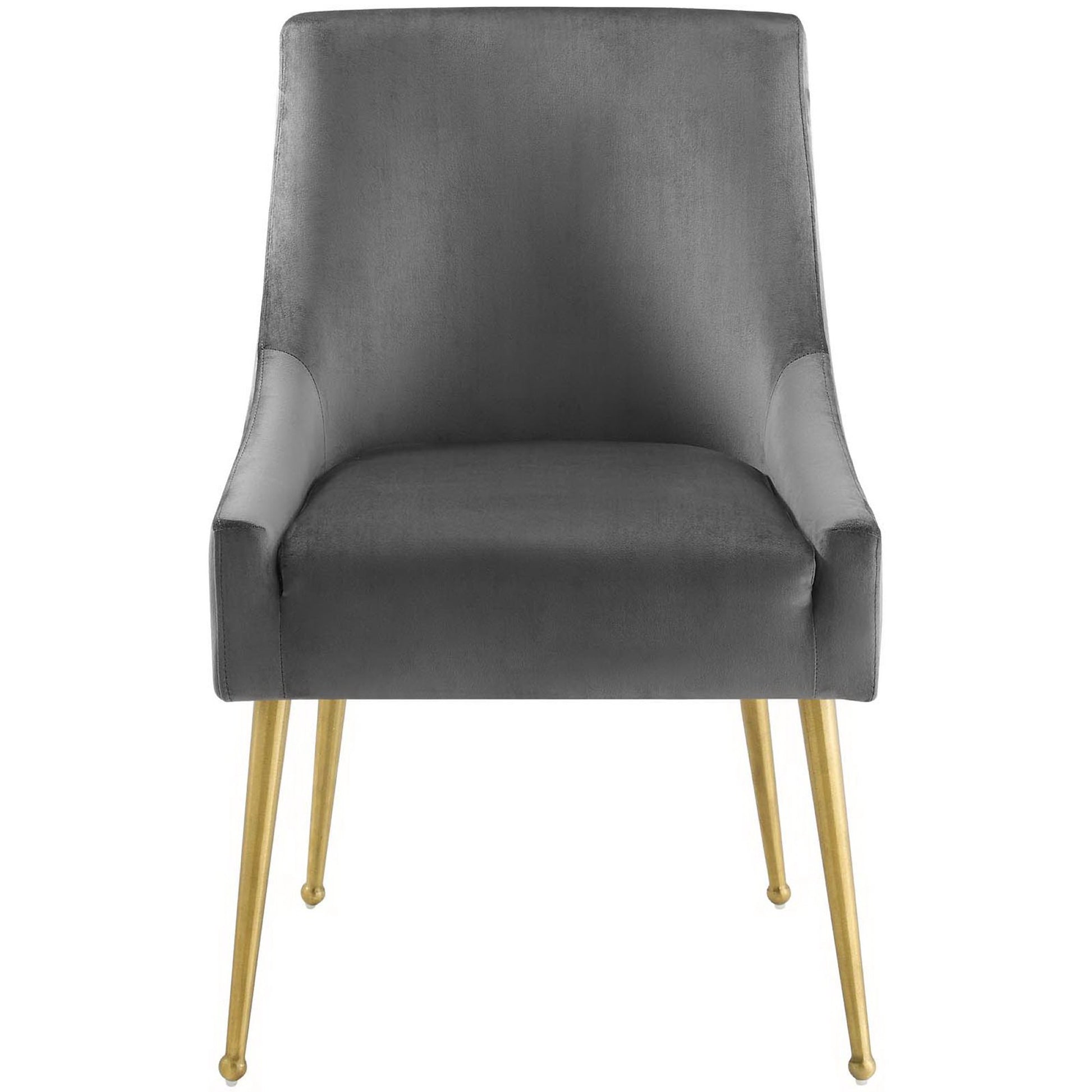 Use:Gently sloping arms cascade down from the flowing design of the Discern Performance Velvet Dining Chair. Solidly constructed from wood and plywood, Discern comes with dense foam padding upholstered in stain-resistant performance velvet. Complete with splayed brushed gold stainless steel legs and matching decorative handle on the back of the chair, Discern is a soft and durable addition to the dining room, kitchen entryway, living room, bedroom, home office, or vanity. Create a cozy seating experience with this versatile dining accent chair with non-marking foot caps.,Dining Room or Accent Chair