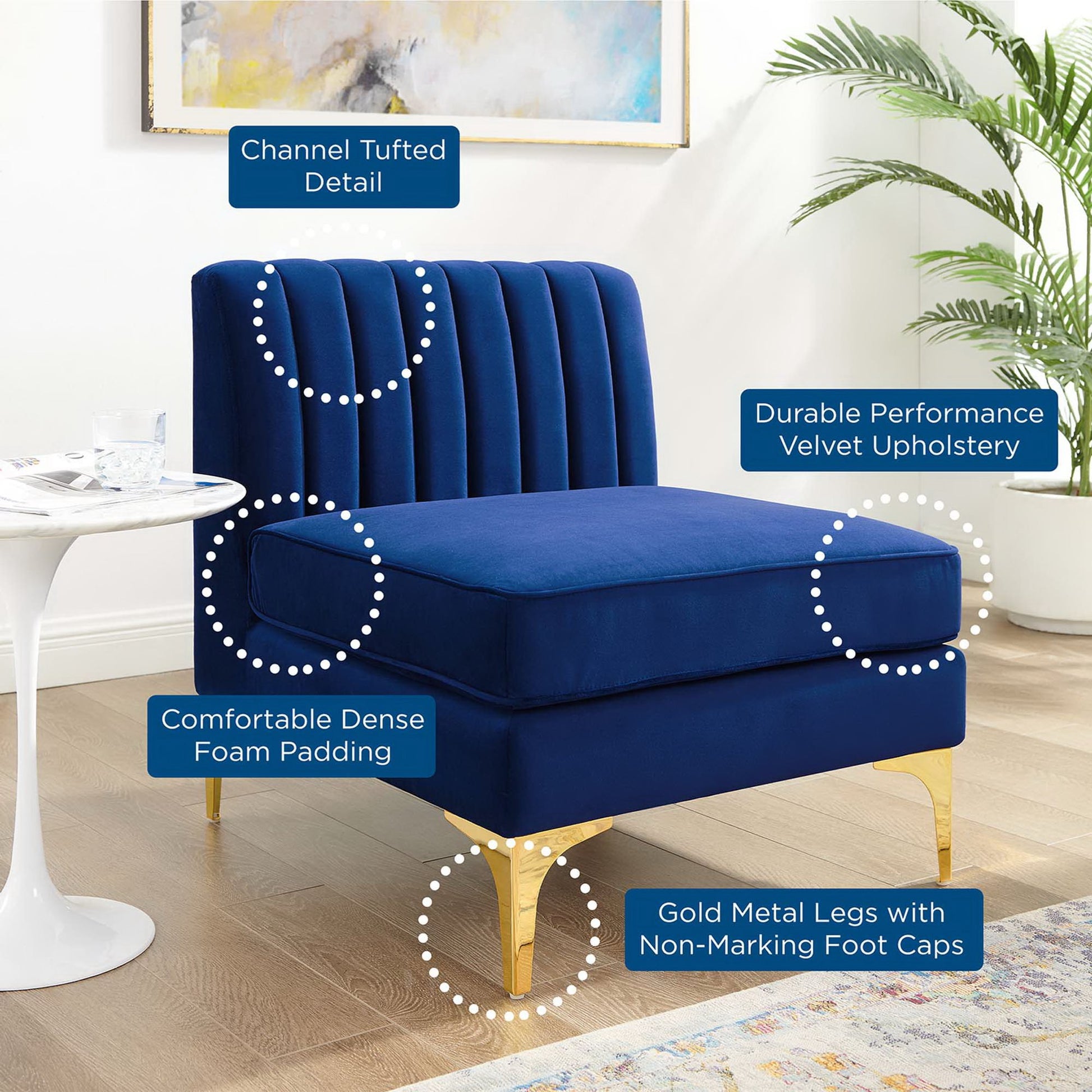 Use:Elevate your living space with the visual appeal and linear detail of the Triumph Channel Tufted Performance Velvet Armless Chair. With interior channel tufting and luxe velvety texture, Triumph abounds in retro modern style and glam deco charm. This armless chair is part of a sectional sofa collection that allows you to create a seating solution that works for your living room, bedroom, office space, entryway, or lounge area. This upholstered chair is covered in stain-resistant performance velvet and features dense foam padding and a sinuous spring support system for a premium seating experience. The velvet chair sits on four gold metal legs with non-marking foot caps to protect your flooring. Armless Chair Weight Capacity: 440 lbs.,Channel Tufted Armless Chair