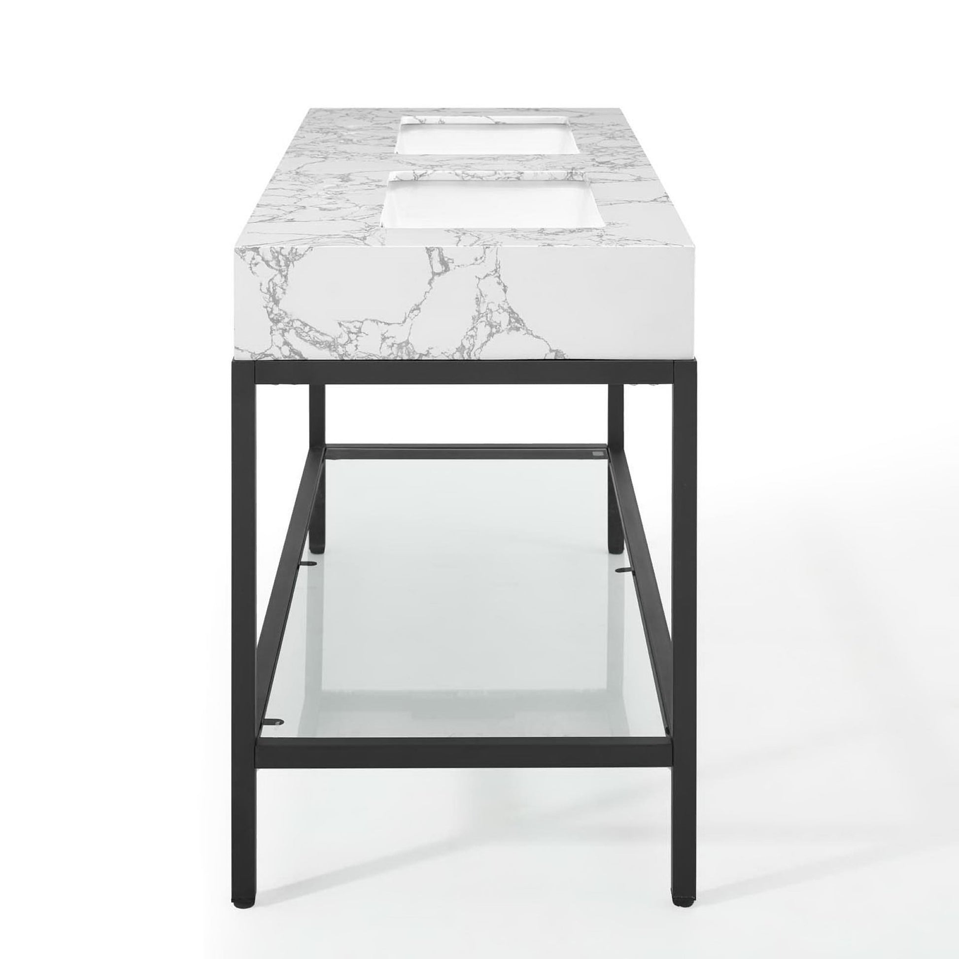 Use:Channel opulence with the glam deco Kingsley Matte Black Stainless Steel Artificial Marble Bathroom Vanity. The Kingsley Bathroom Vanity introduces a royal style to your bathroom with the dual artificial marble curved basins and matte black metal accents. Resting on a black stainless steel frame, the Kingsley 8-Inch Centerset Bathroom Vanity features a modern glass shelf for storing all your bathroom essentials and rests on non-marking foot caps to protect flooring. Assembly required, fixtures not included.,Glam Deco Bathroom Vanity