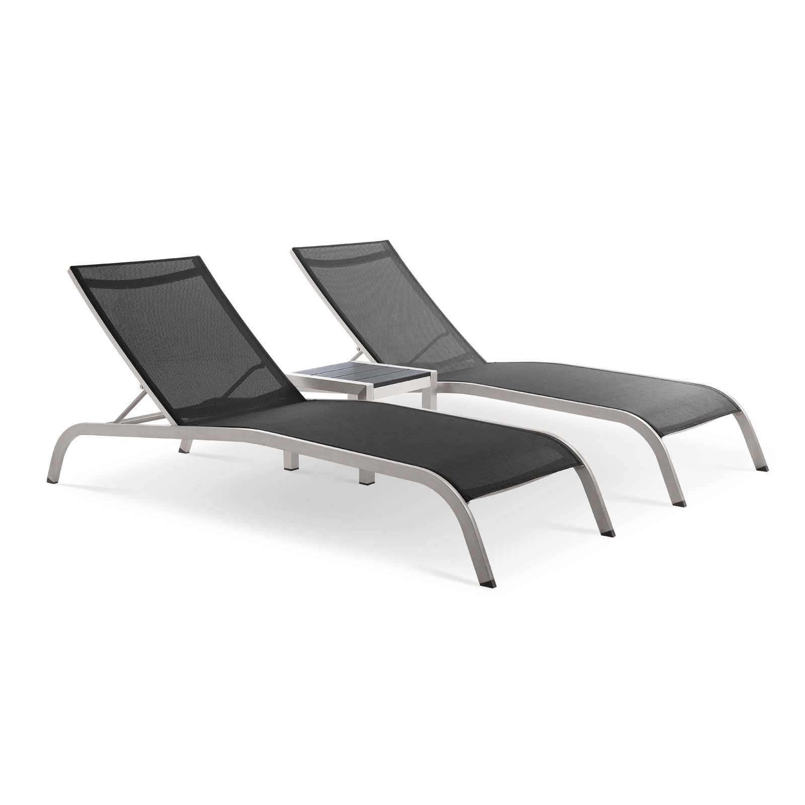 Use:Energize your patio decor with the versatile vintage glamour Savannah Outdoor Patio Mesh Chaise Lounge Chair Set with Side Table. A sleek design that evokes a retro-modern feel, Savannah chaise lounge chairs feature all-weather Textilene mesh fabric that creates a breathable fabric for a pleasant outdoor lounging experience. Complete with an anodized matte aluminum frame with non-marking foot caps, these deceptively simple pieces create an aura of vintage glamour in your patio decor. This set of elegant outdoor sun loungers is a perfect addition to the backyard, poolside, porch, deck, or balcony. Chair Weight Capacity: 661 lbs.,Patio Chaise Lounge Chairs