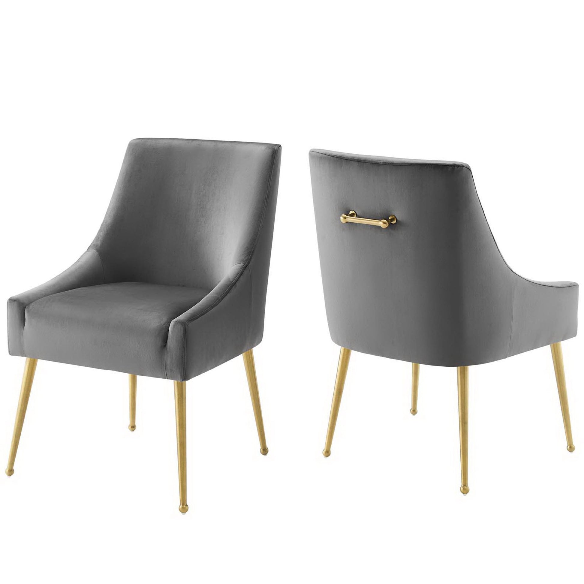 Use:Gently sloping arms cascade down from the flowing design of the Discern Performance Velvet Dining Chair Set of 2. Solidly constructed from wood and plywood, Discern comes with dense foam padding upholstered in stain-resistant performance velvet. Complete with splayed brushed gold stainless steel legs and matching decorative handle on the back of the chair, Discern is a soft and durable addition to the dining room, kitchen entryway, living room, bedroom, home office, or vanity. Create a cozy seating experience with these versatile dining accent chairs complete with non-marking foot caps.,Dining Room or Accent Chair Set of 2