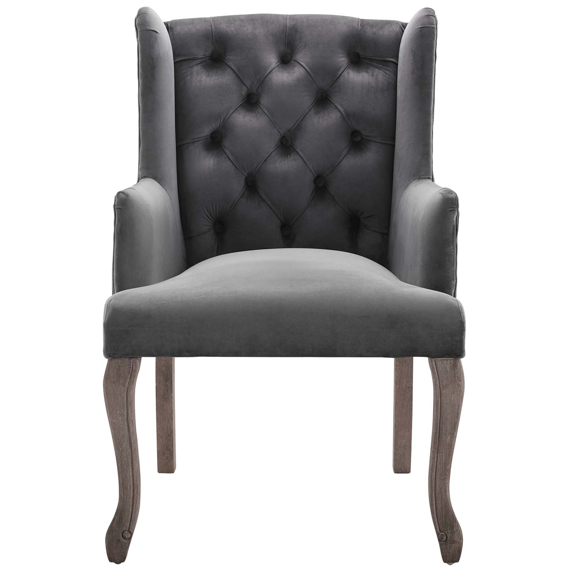 Use:Elevate your living room, entryway, bedroom or home office decor with the Realm French Vintage Performance Velvet Dining Armchair. Elegantly designed with deep-button tufting, weathered wood cabriole legs with chiseled artisan detail, this wingback chair makes a chic statement with timeless detail and modern farmhouse intrigue. Finely upholstered in stain-resistant performance velvet with dense foam padding, charming French piping, and a sinuous spring support system for exceptional comfort, Realm creates a cozy spot to sit back and relax. Realm includes plastic foot caps. Armchair Weight Capacity: 300 lbs.,French Vintage Dining Armchair