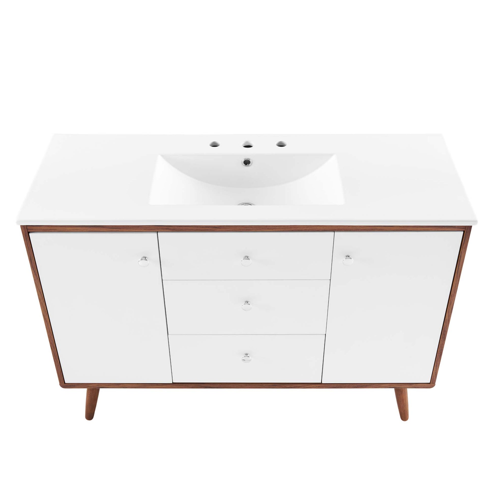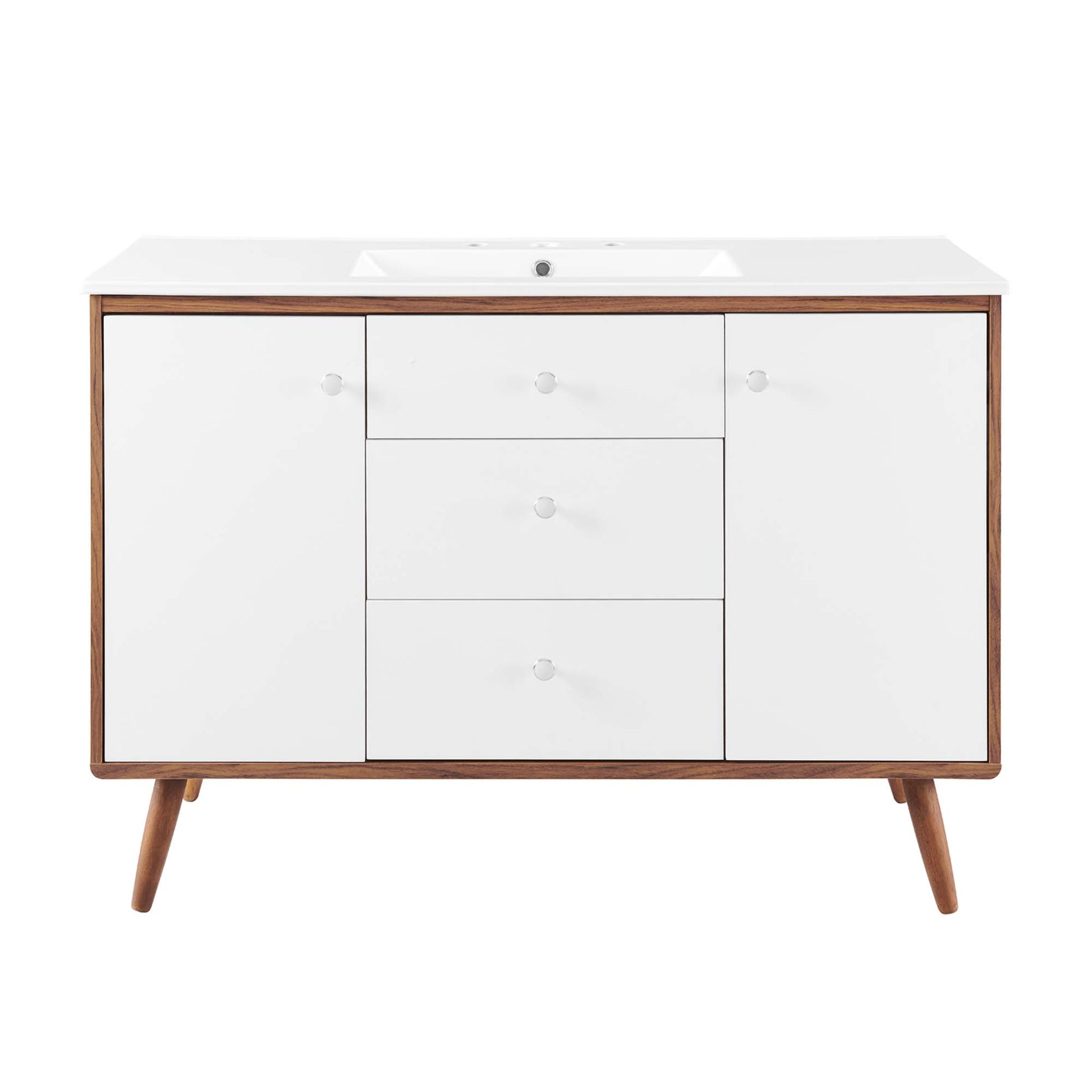 Use:Bring mid-century modern aesthetics into the bathroom with the Transmit 48" Bathroom Vanity. This vanity features a durable particleboard and walnut grain veneer construction with ample storage space for all your bathroom essentials behind two white lacquered soft-close hinged doors and two full-extension drawers with a fixed center drawer. A ceramic sink with an integrated countertop, 8" centerset, and rectangular sink basin continue the sleek look of this retro modern vanity. Complete with chrome knobs, this bathroom vanity rests atop four splayed wood legs. Assembly required and sink fixtures not included.,Mid-Century Modern Vanity