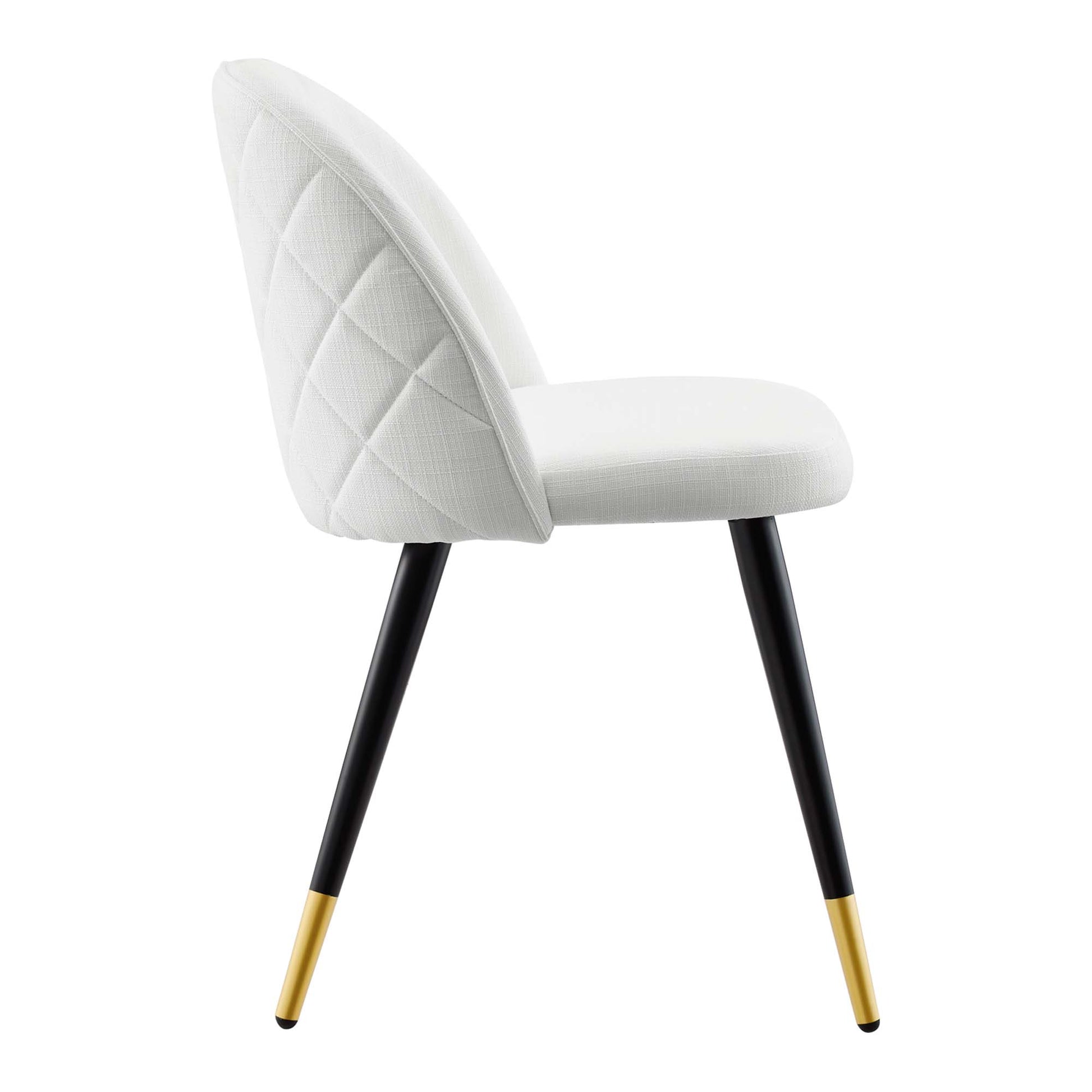 Use:Inspire whimsical dining and stylish living with the Cordial Fabric Upholstered Dining Chairs - Set of 2. Featuring a rounded silhouette with French piping detail and a diamond lattice pattern along the back, these upholstered chairs are covered in soft polyester fabric and padded in dense foam to grant supportive comfort while dining or relaxing. A versatile addition to the dining room, kitchen, living room, home office, or entryway, these accent chairs rest atop black metal legs with gold accents and non-marking foot caps. Chair Weight Capacity: 300 lbs.,Retro Modern Dining Side Chairs